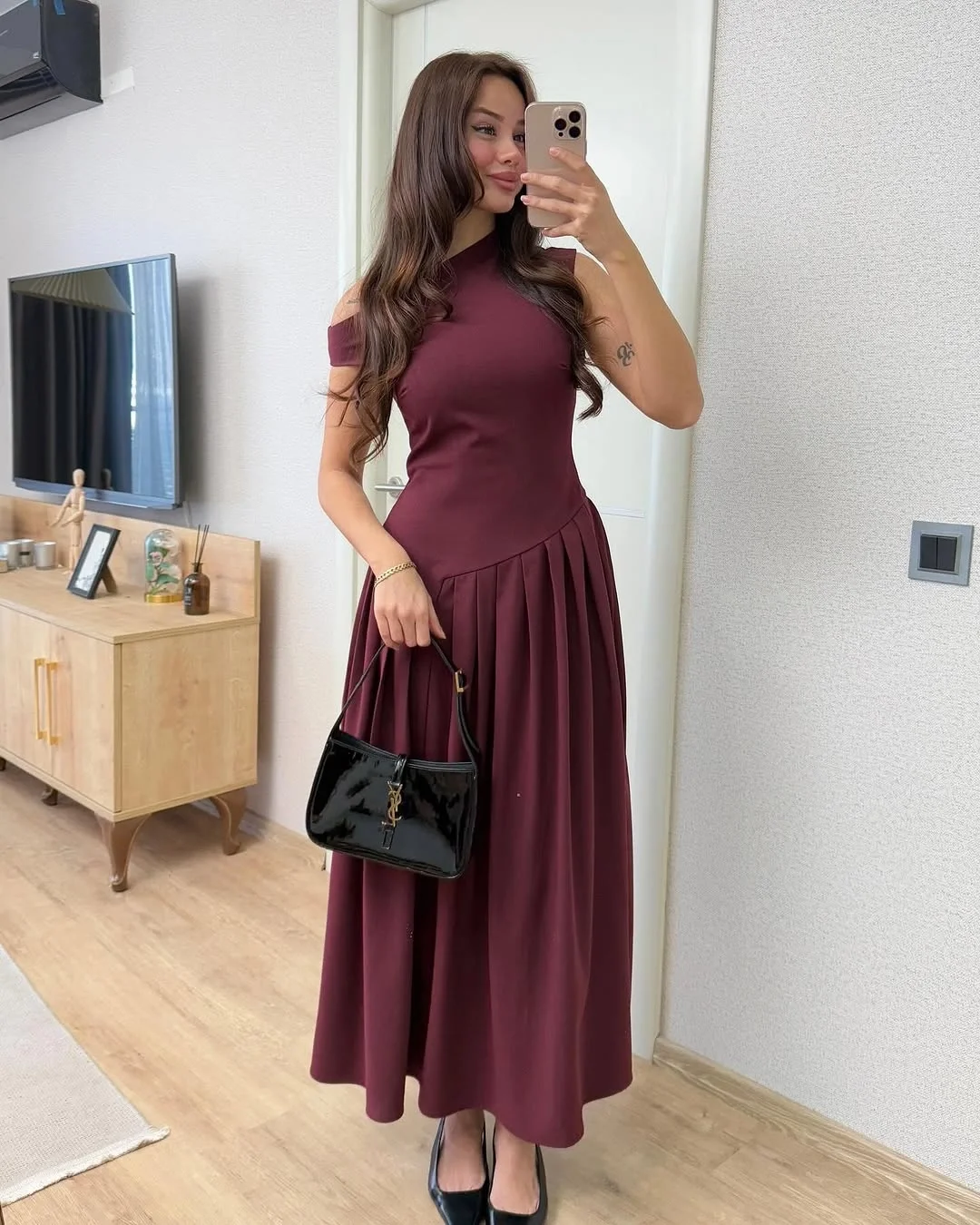 Omuz Detaylı Pliseli Bordo Elbise, şıklığı ve zarafeti bir arada sunan Bak Moda'nın öne çıkan tasarımlarından biridir.