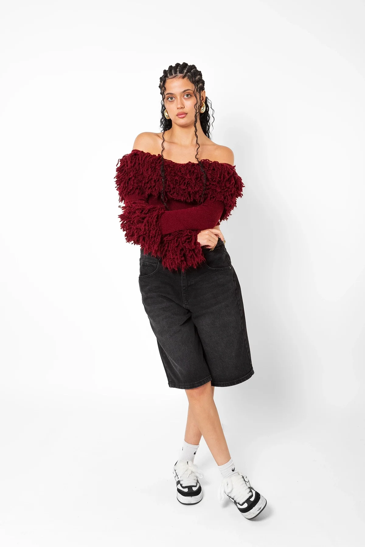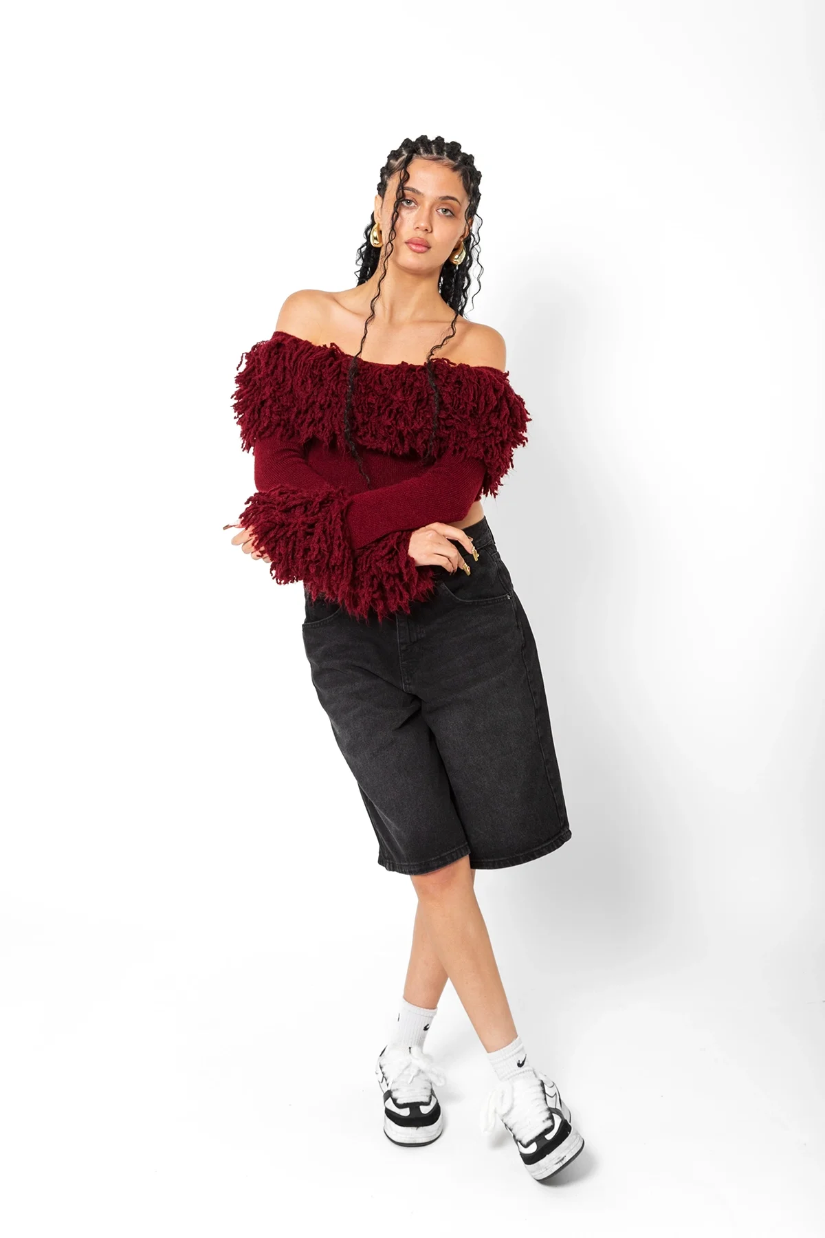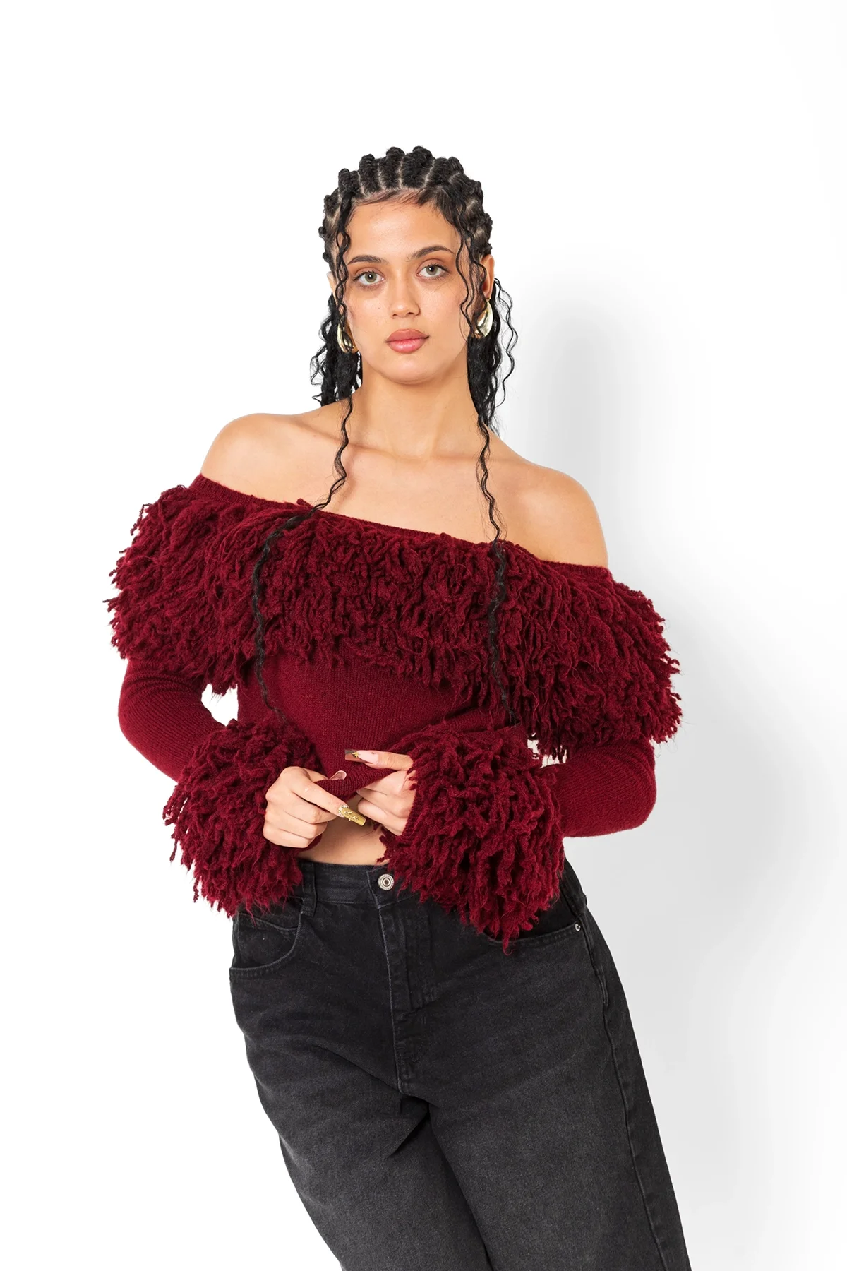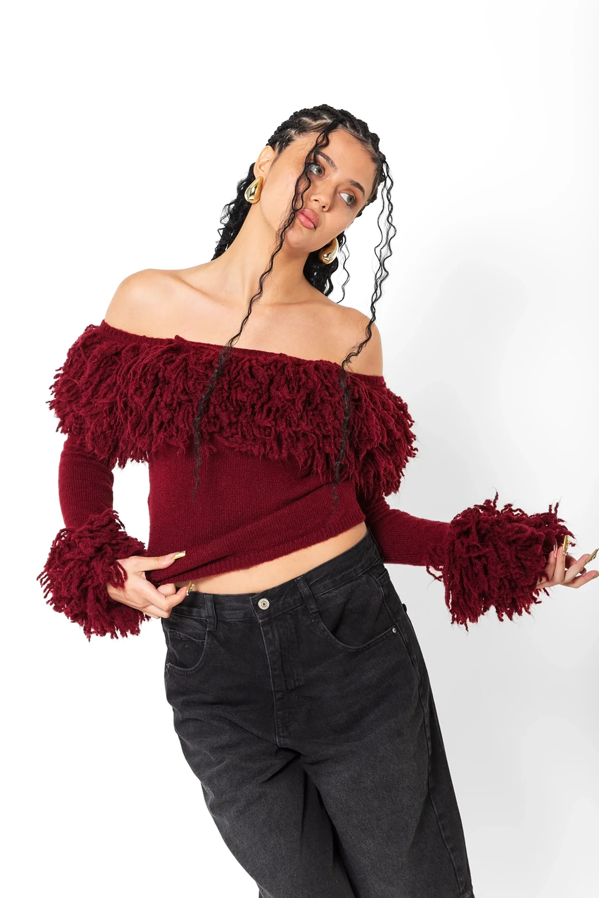 PÜSKÜLLÜ MADONNA YAKA BORDO TRİKO BLUZ