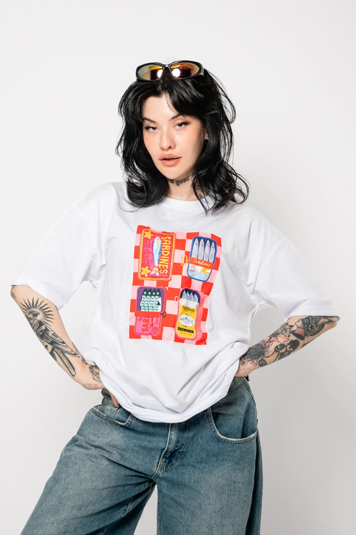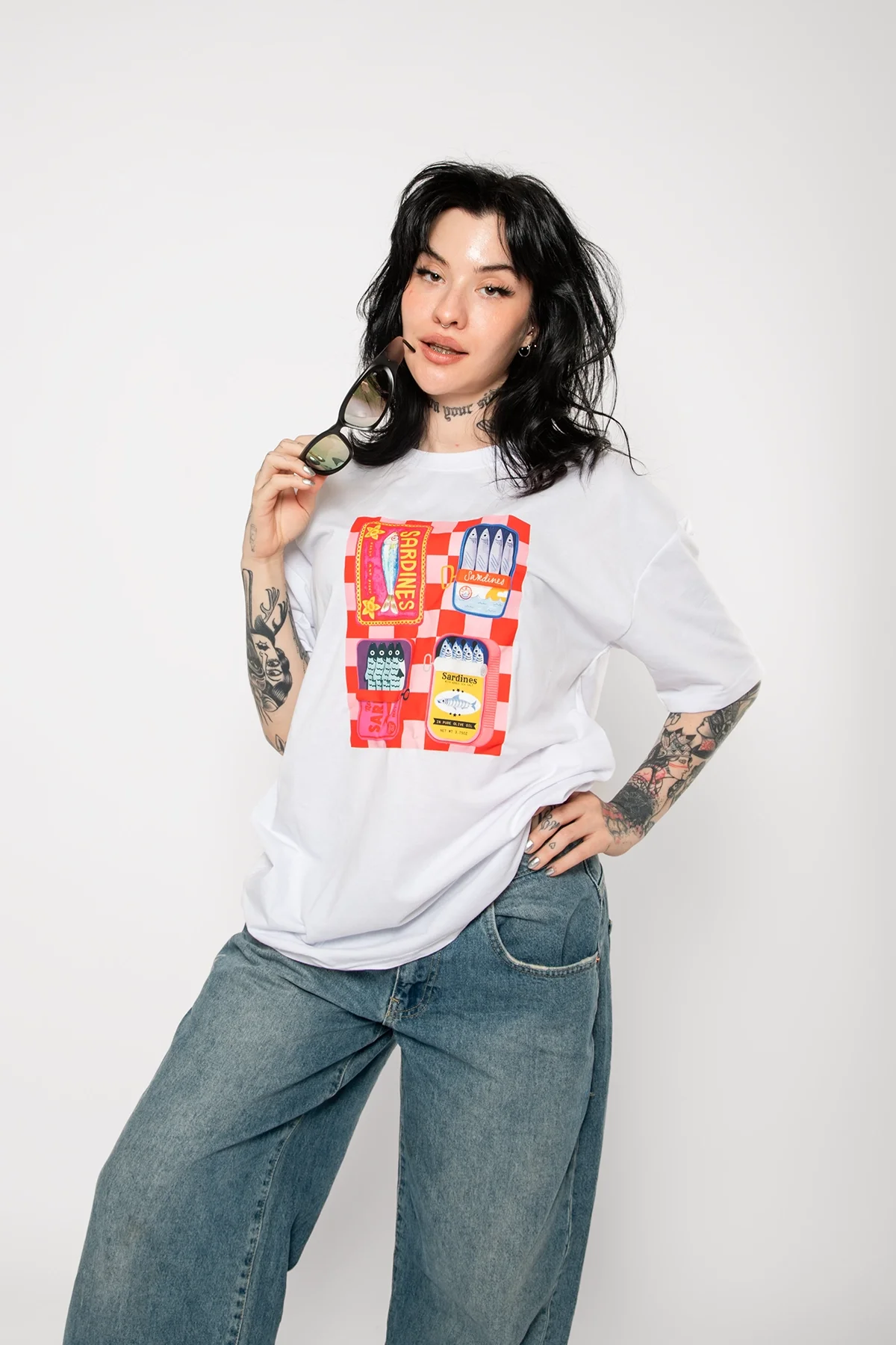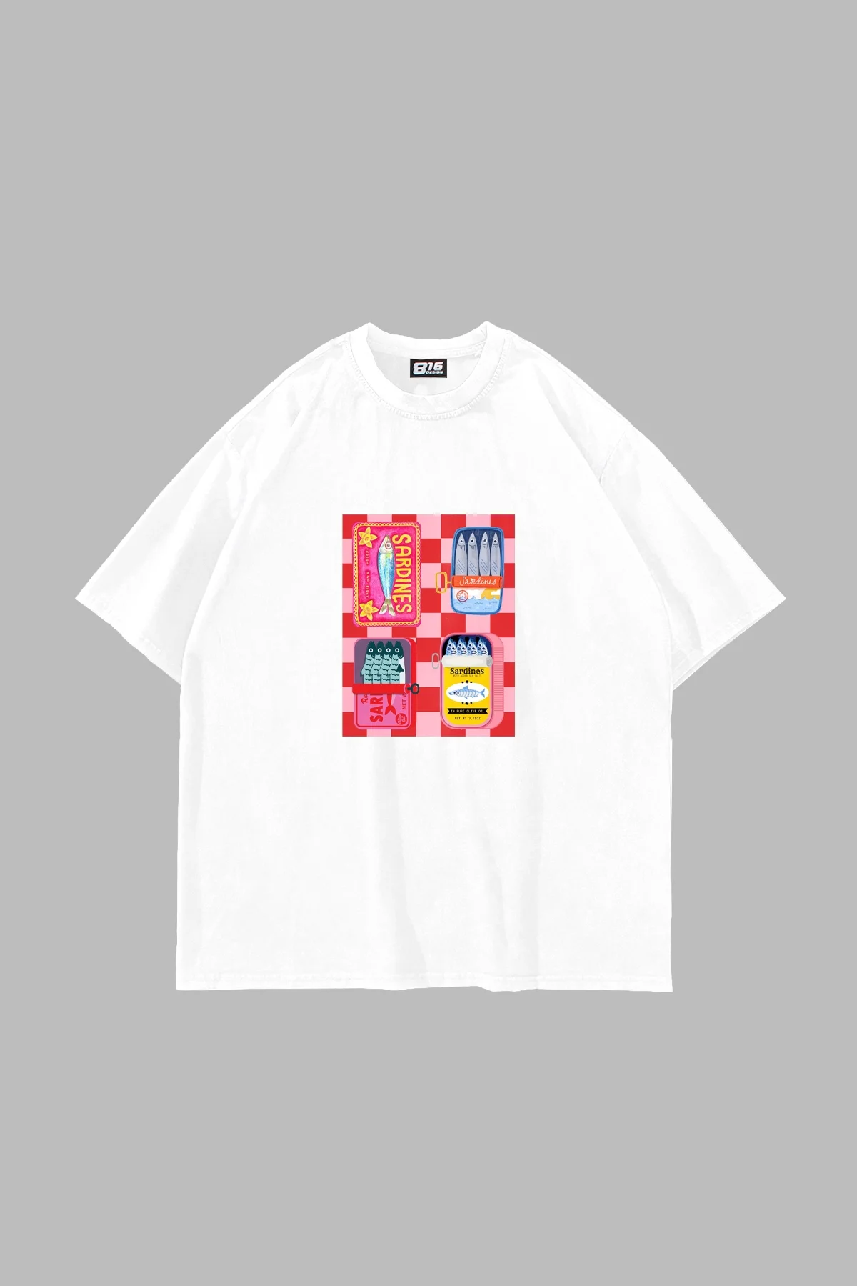 Sardines Baskılı Oversize Unisex Beyaz Tshirt, tarzınızı yansıtmak isteyenler için ideal bir seçenektir.