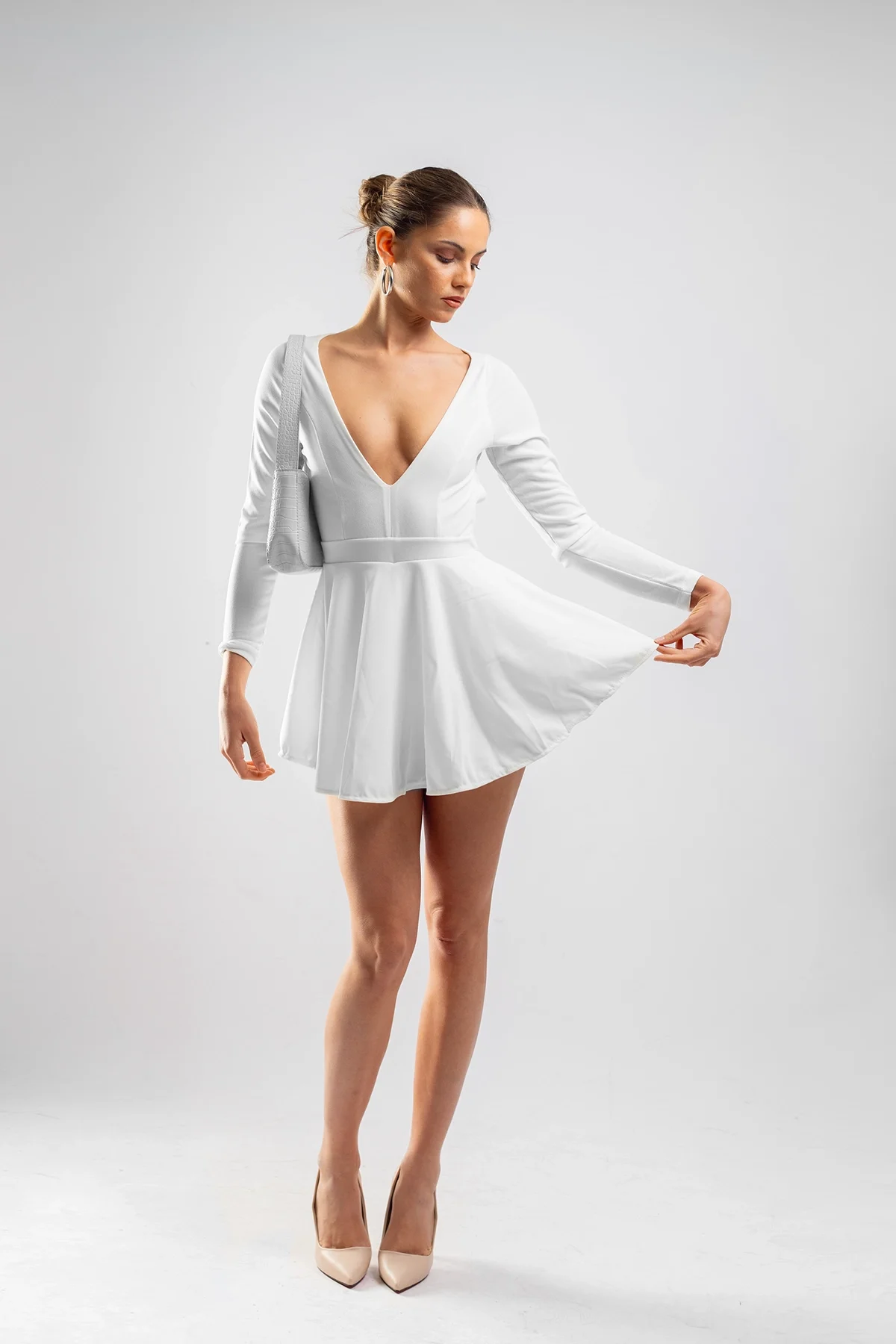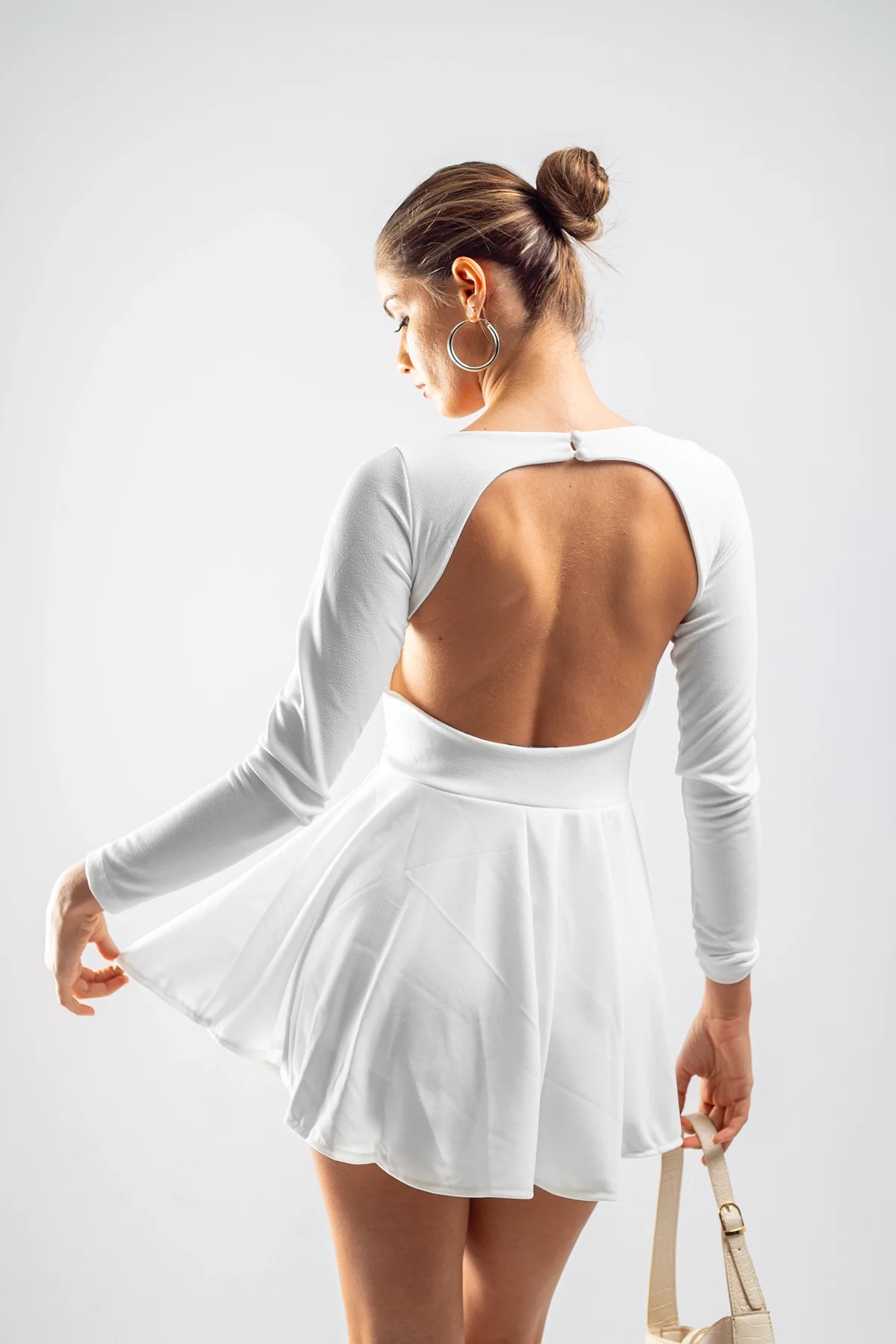 SIRT DEKOLTELİ BEYAZ VOLANLI ŞORT ETEK MİNİ ELBİSE