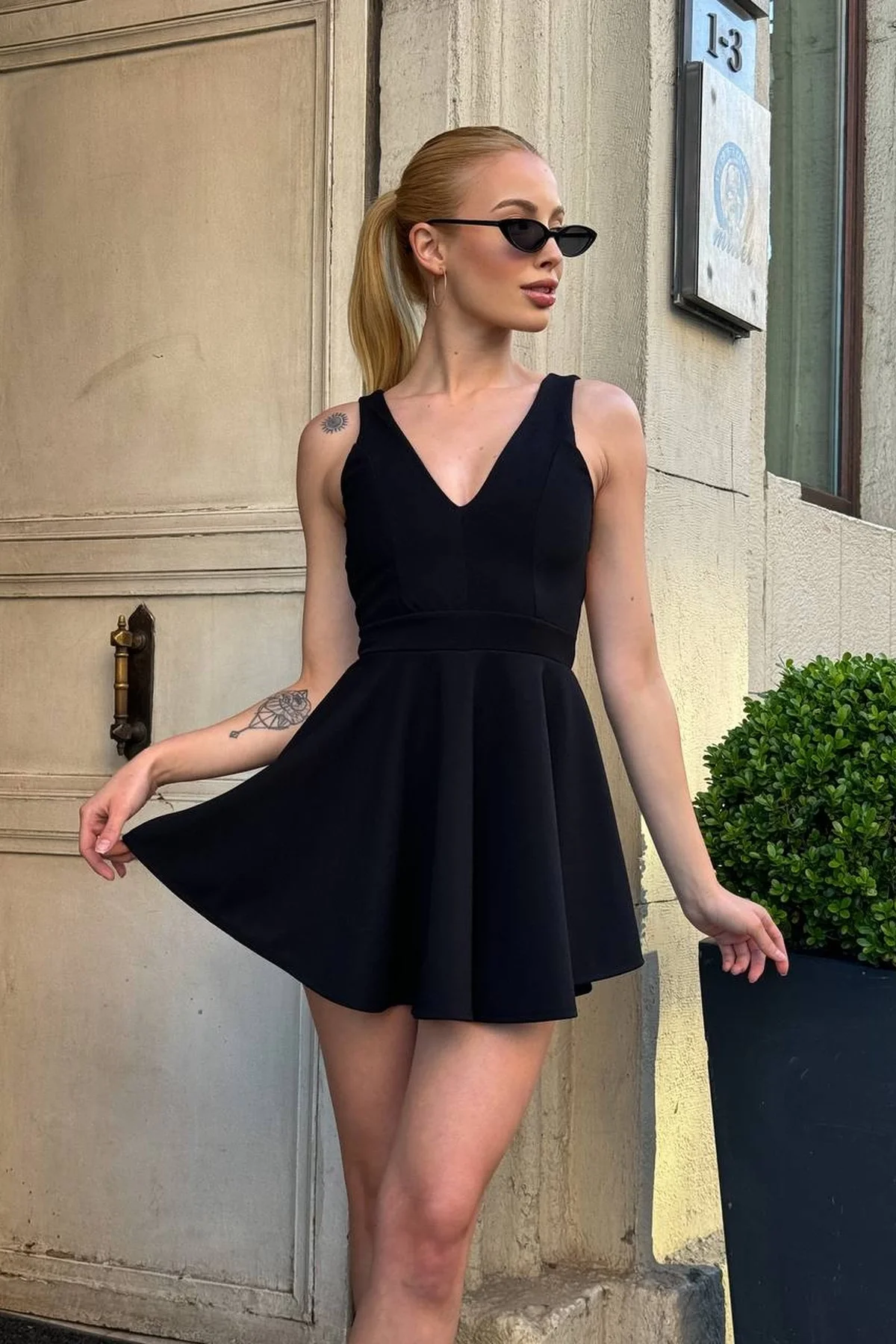 SIRT DEKOLTELİ SİYAH VOLANLI SIFIR KOL ŞORTLU ELBİSE