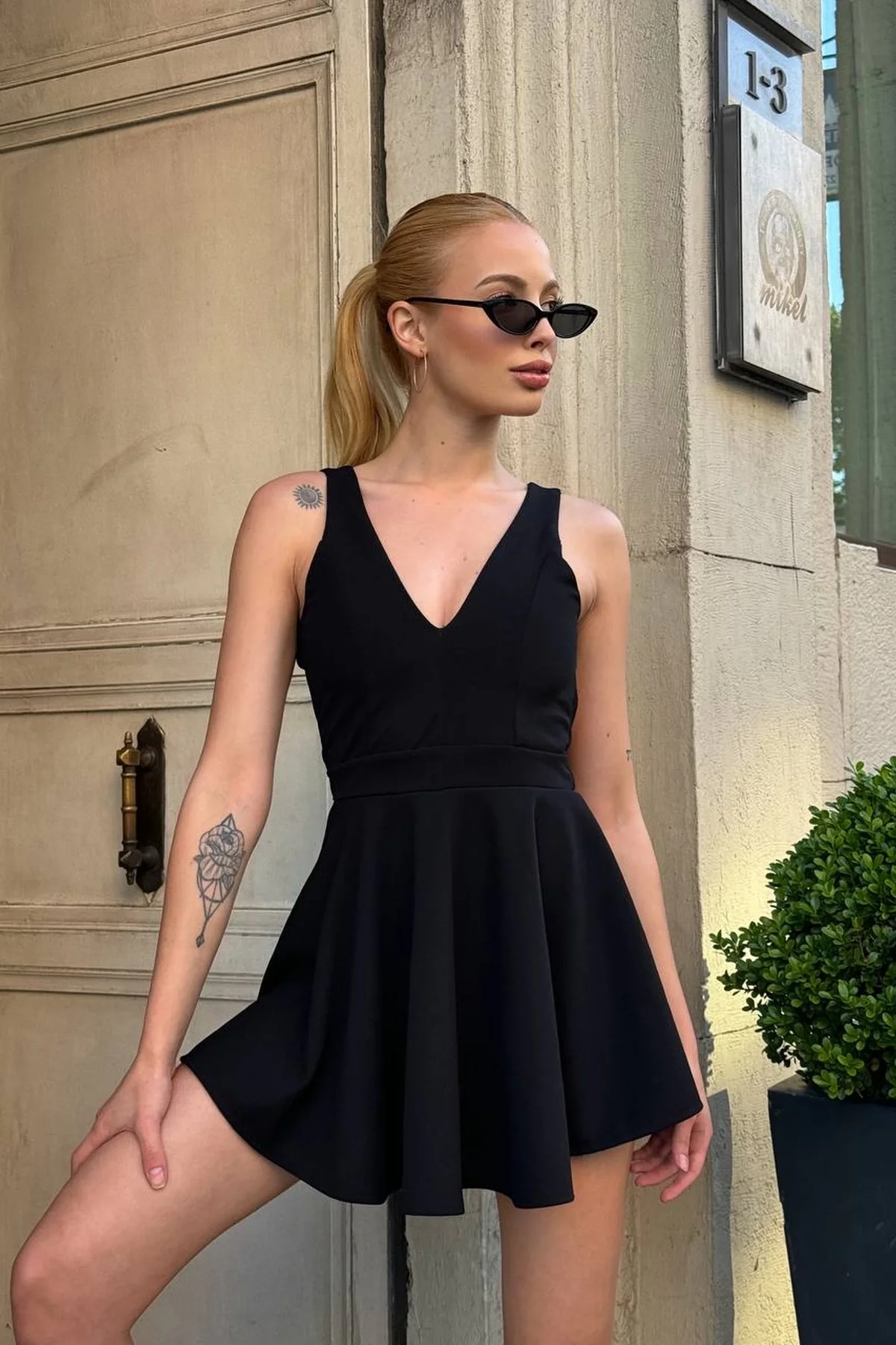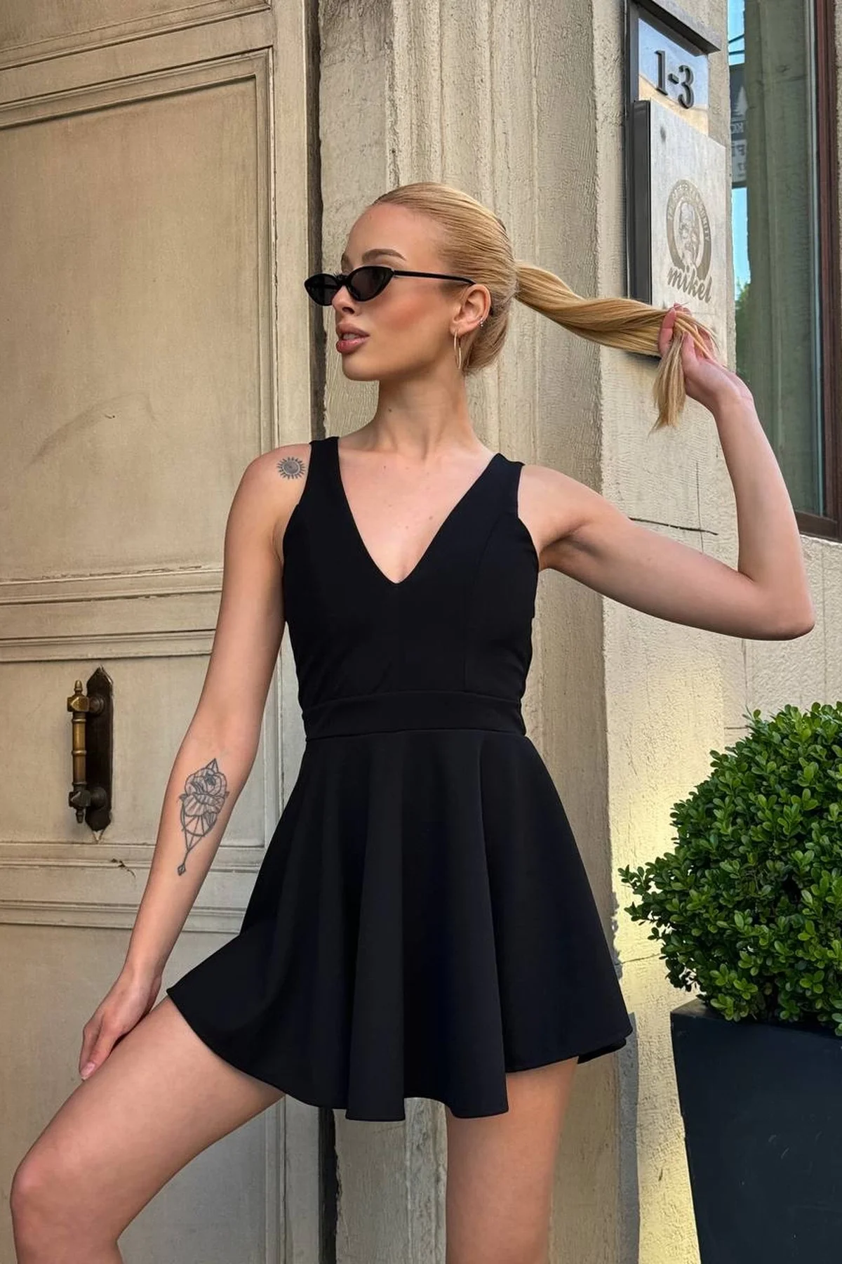 Sırt dekolteli, siyah renkli, volan detaylı ve sıfır kol tasarımıyla öne çıkan şortlu elbise; hem şık hem rahat bir görünüm sunar. Yaz ayları için ideal olan bu parça, feminen ve modern tarzı bir araya getirir.