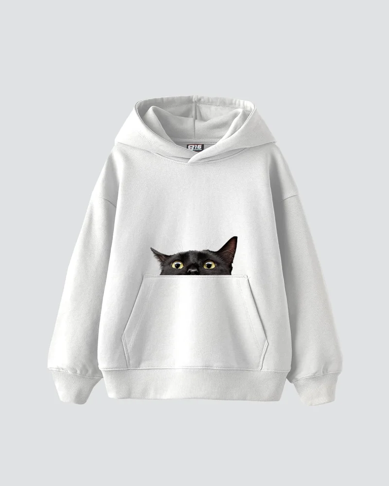 Black Cat Baskılı Oversize Unisex Premium Beyaz Hoodie