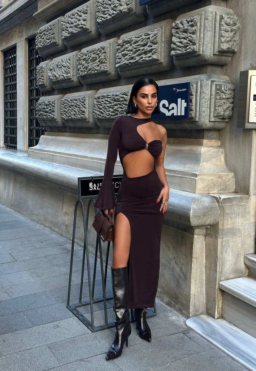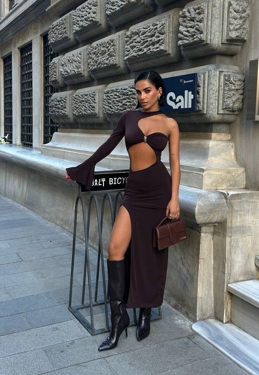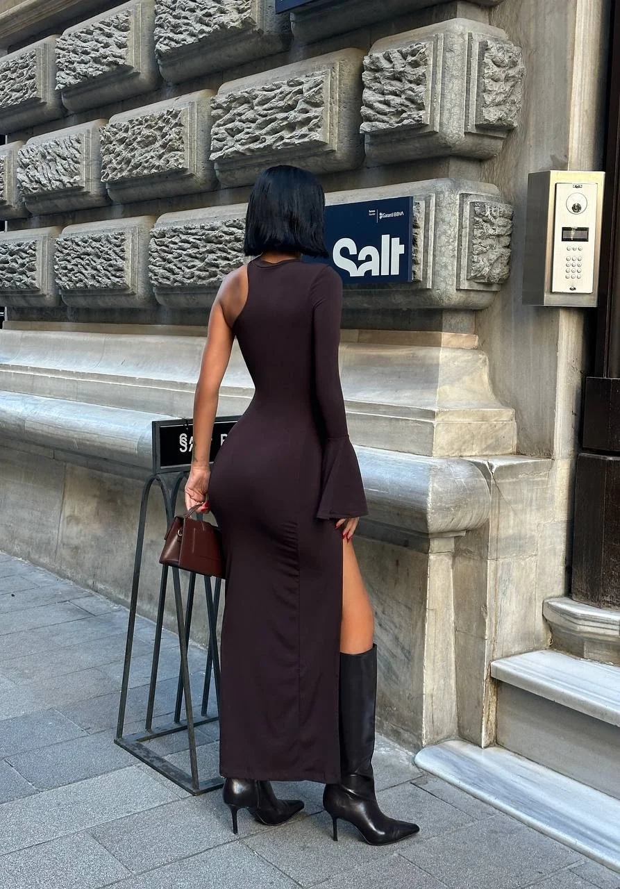 Zarafetin modern yorumuyla tasarlanan tek kol yırtmaç detaylı uzun elbise, stil sahibi kadınların gardırobuna iddialı bir dokunuş katıyor. Tek omuz kesimiyle asimetrik bir şıklık sunarken, bacak yırtmacı detayı elbiseye hem feminen hem cesur bir hava kazandırır.