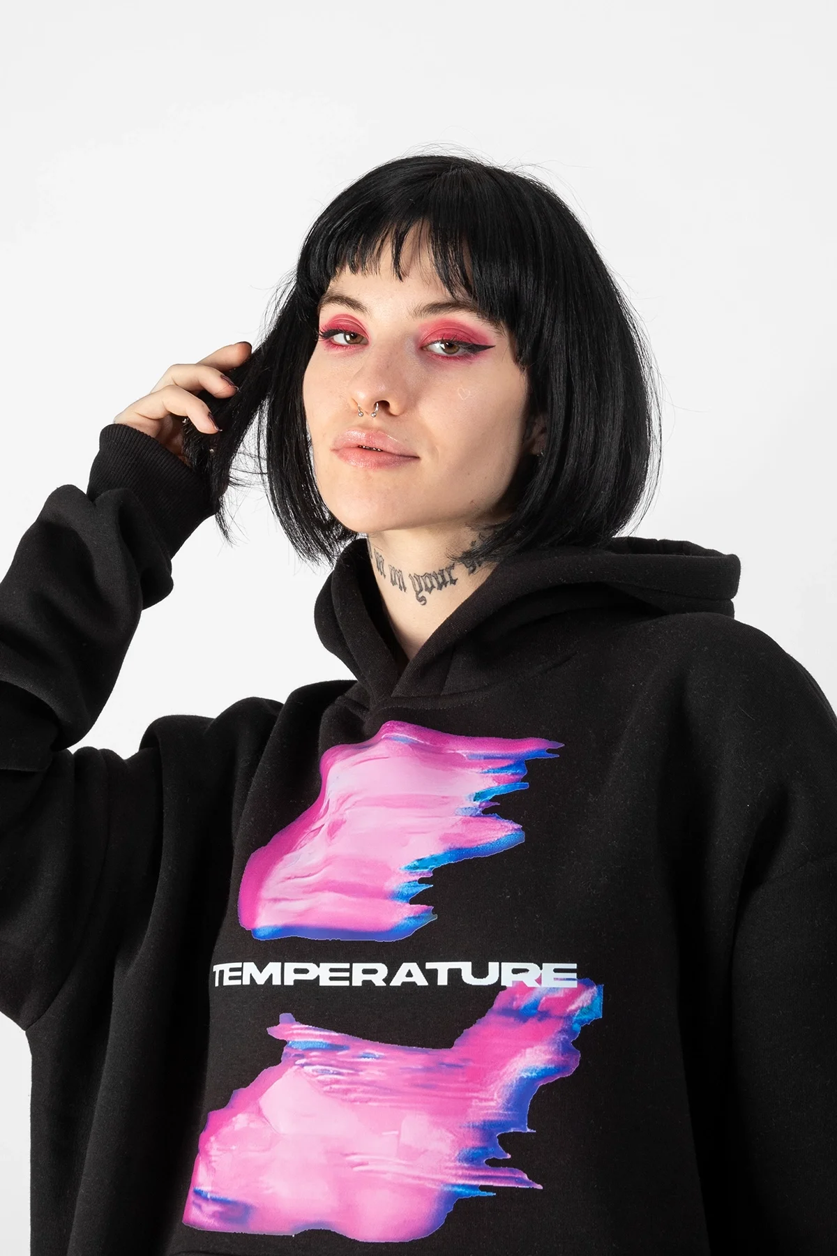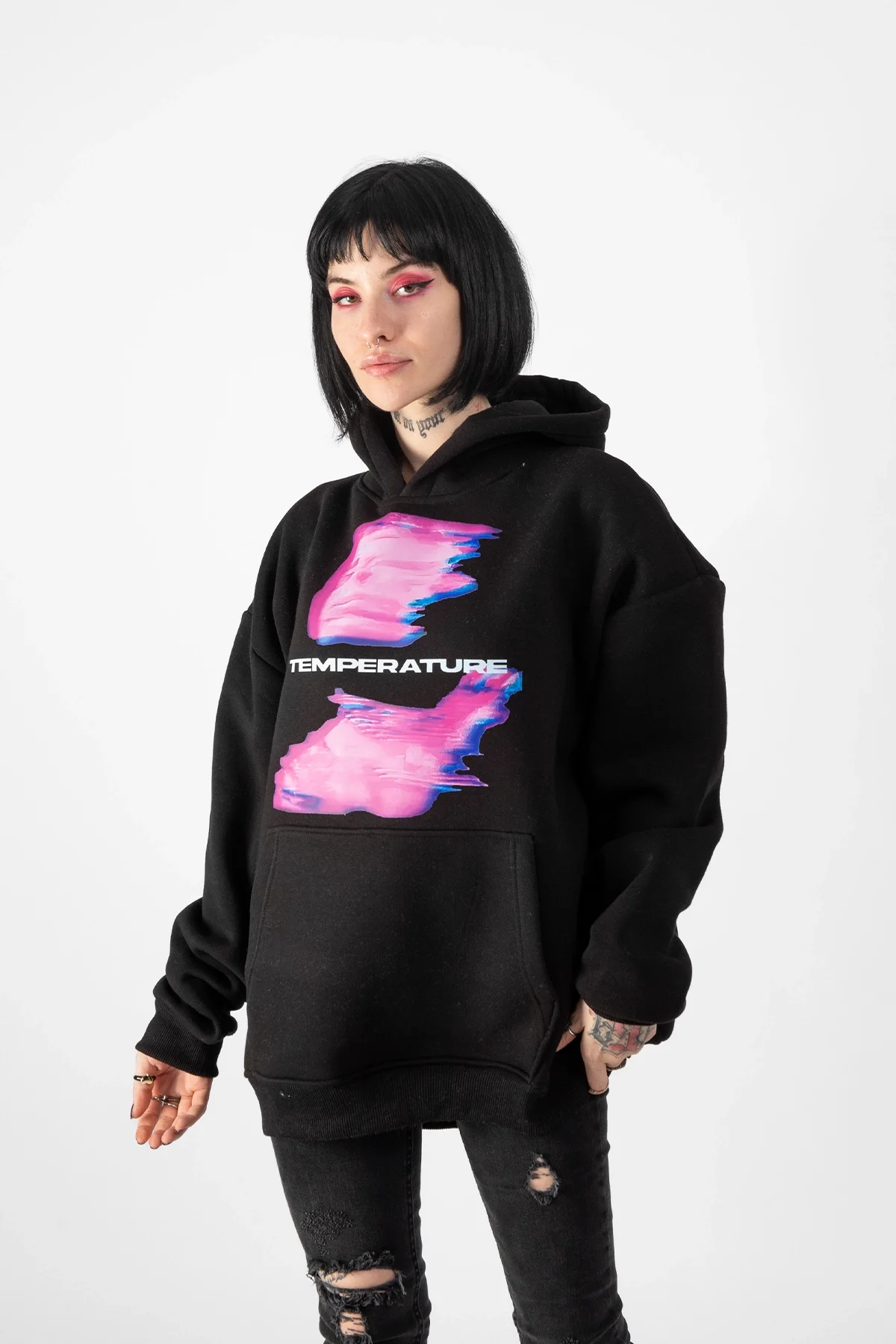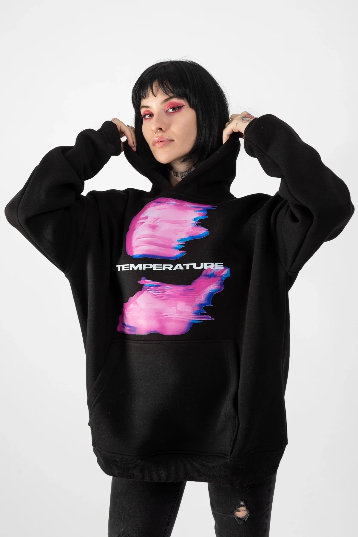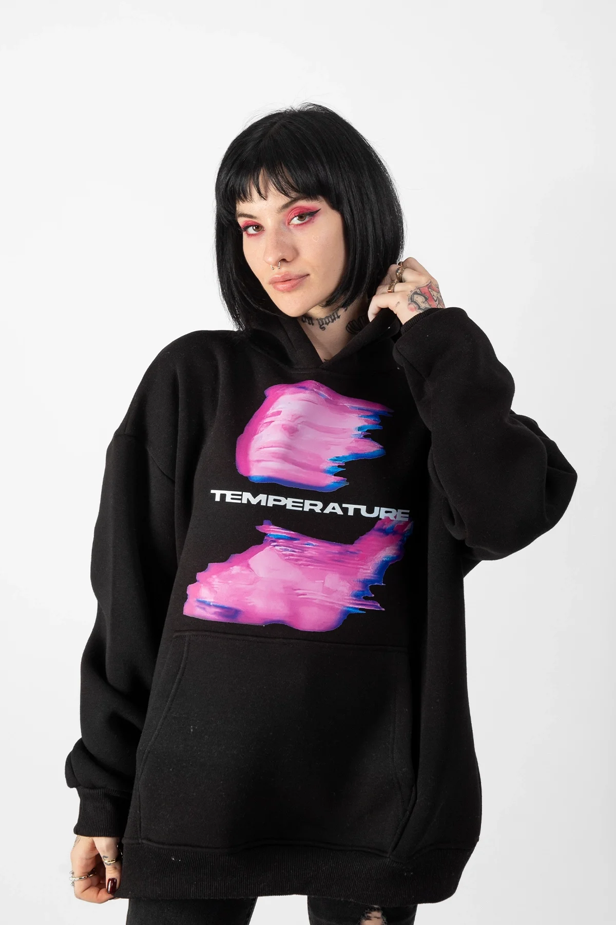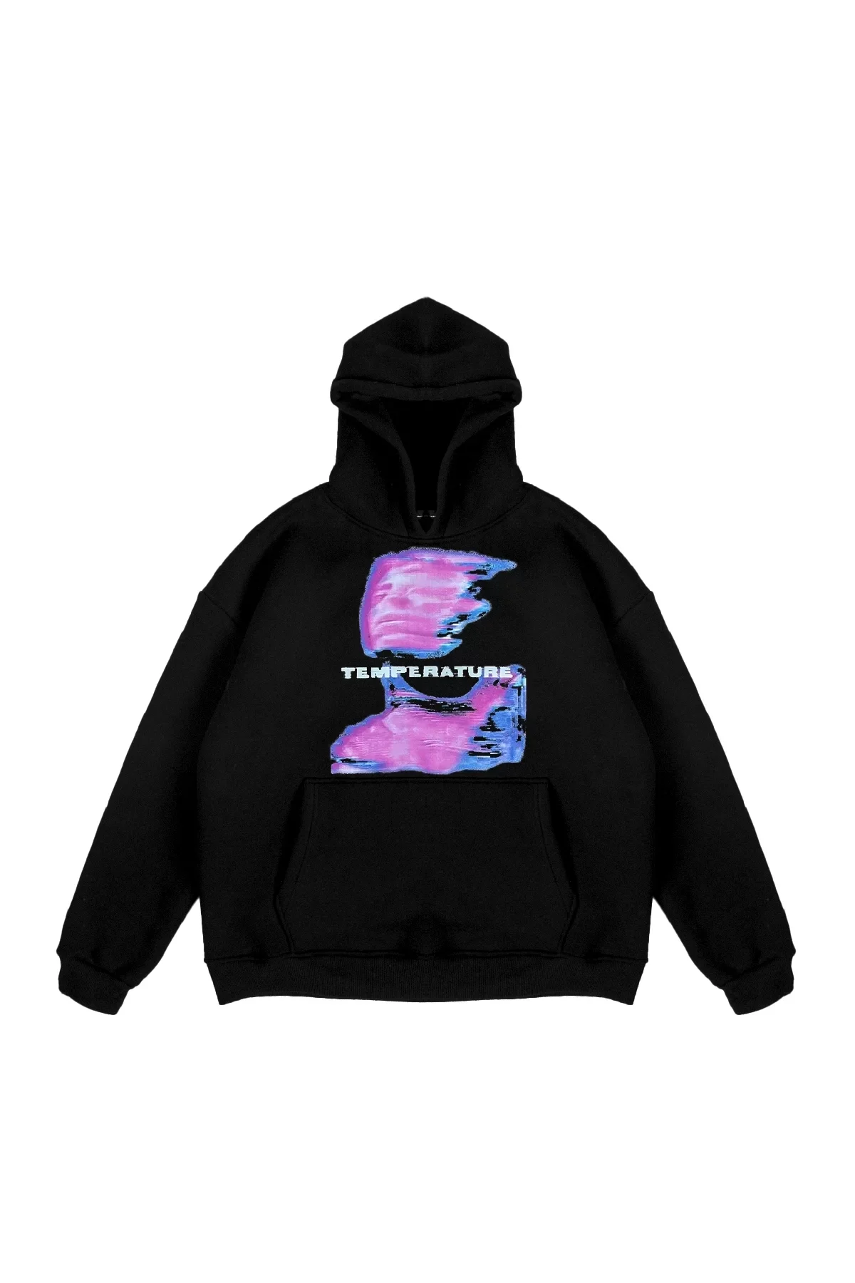 TEMPERATURE BASKILI OVERSİZE UNİSEX SİYAH HOODİE
