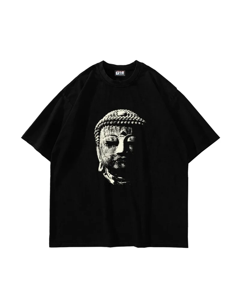Buddha Baskılı Oversize Unisex Yıkamalı Siyah Tshirt