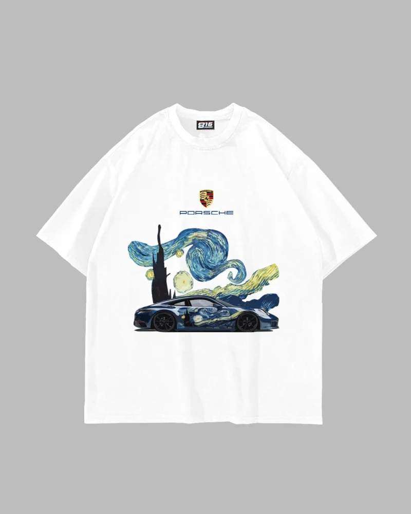 Starry Night Porsche Baskılı Oversize Unisex Beyaz Tshirt
