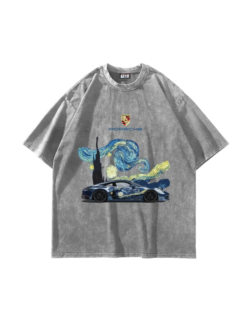 Starry Night Porsche Baskılı Oversize Unisex Yıkamalı Beyaz Tshirt