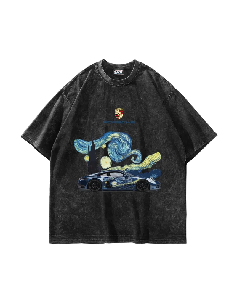 Starry Night Porsche Baskılı Oversize Unisex Yıkamalı Siyah Tshirt