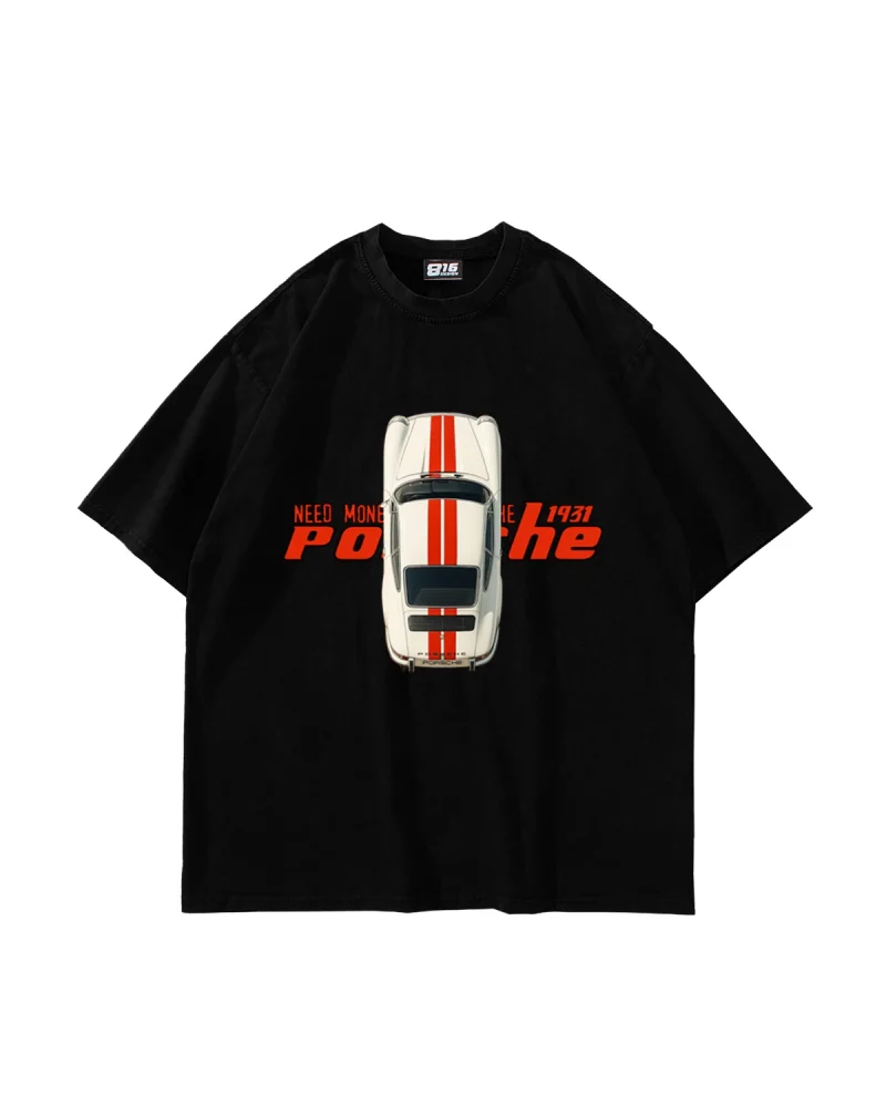 V4 Need Money For Porsche Baskılı Oversize Unisex Yıkamalı Siyah Tshirt