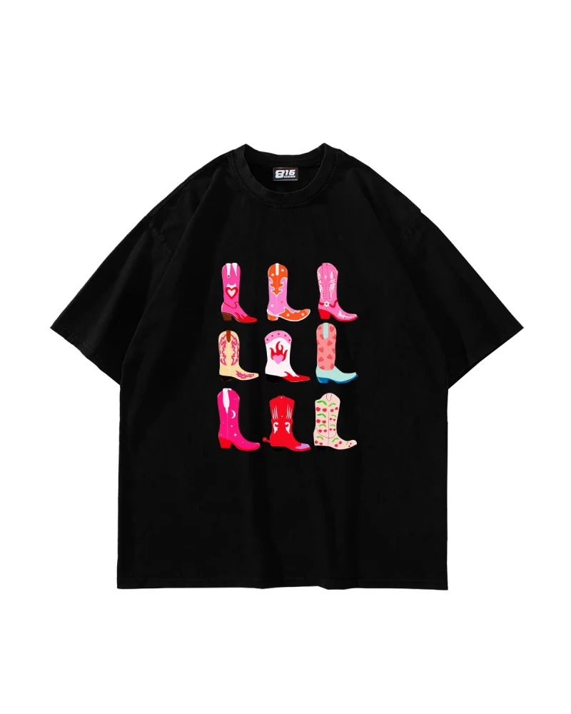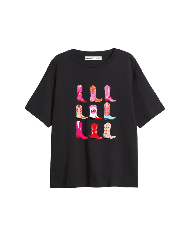 Fun Cowboy Baskılı Relaxed Fit Siyah Kadın Tshirt