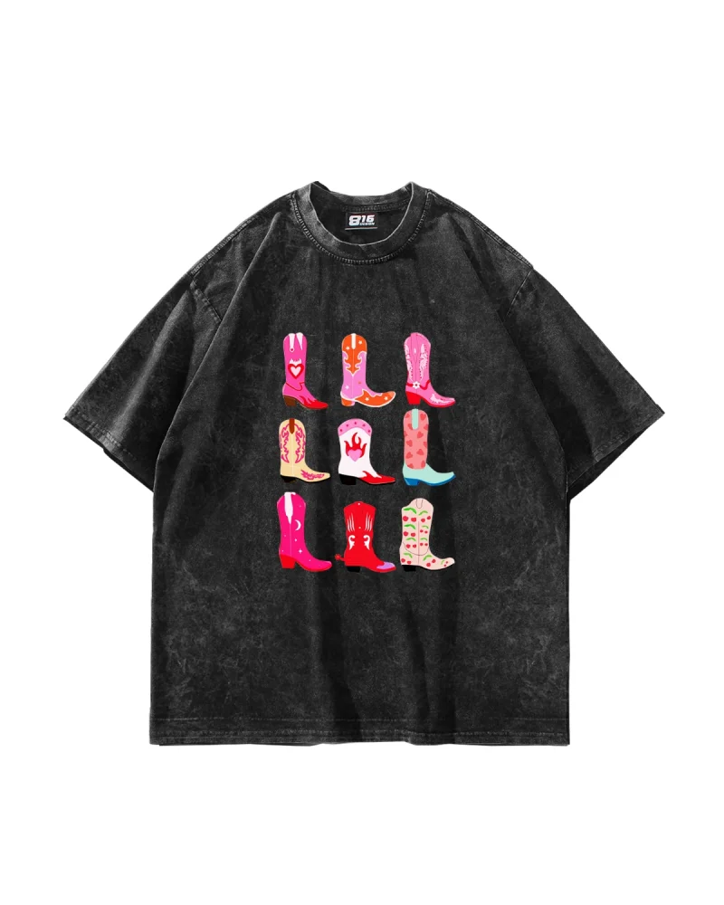 Fun Cowboy Baskılı Oversize Unisex Yıkamalı Siyah Tshirt
