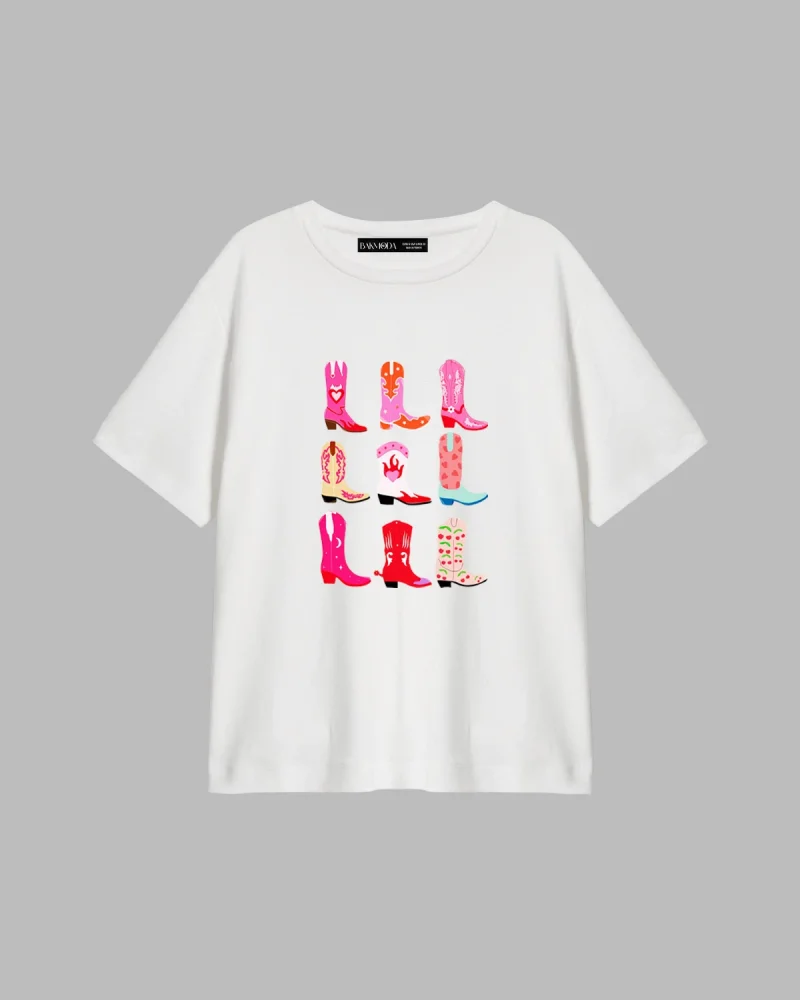 Fun Cowboy Baskılı Relaxed Fit Beyaz Kadın Tshirt