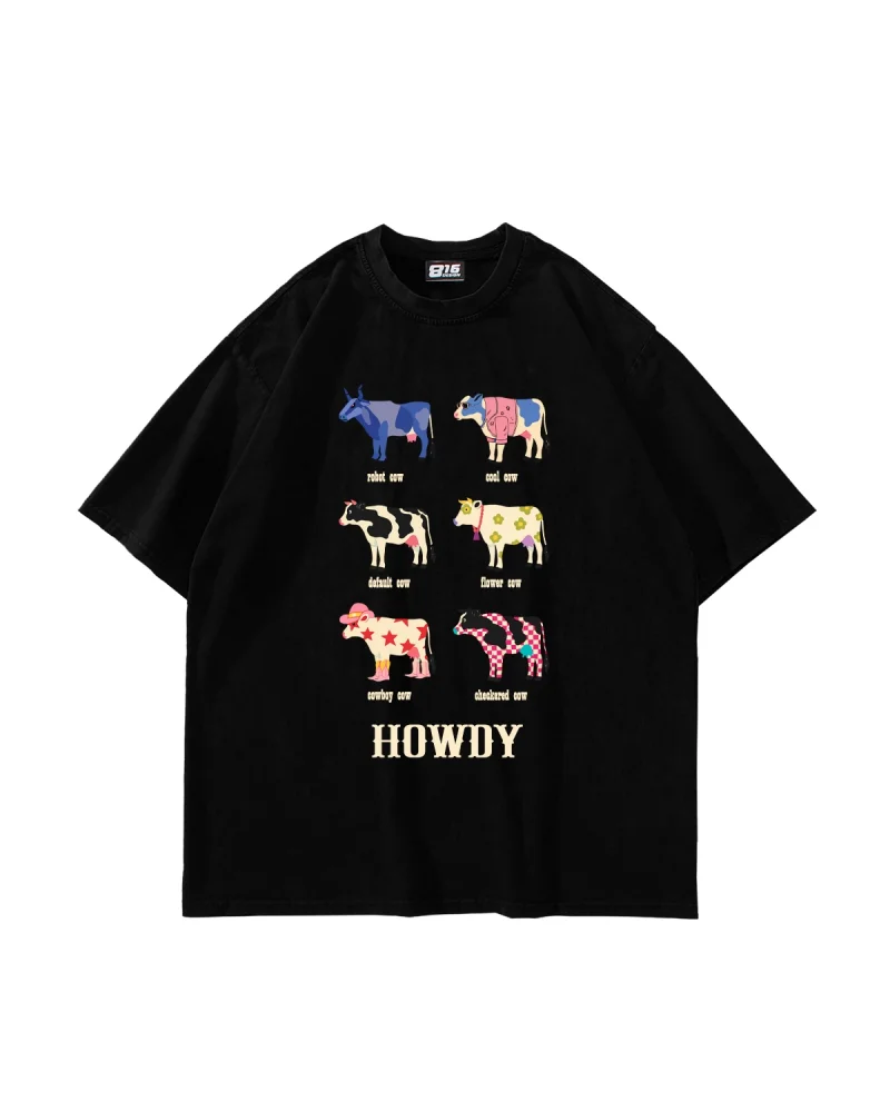 Howdy Cows Baskılı Oversize Unisex Siyah Tshirt