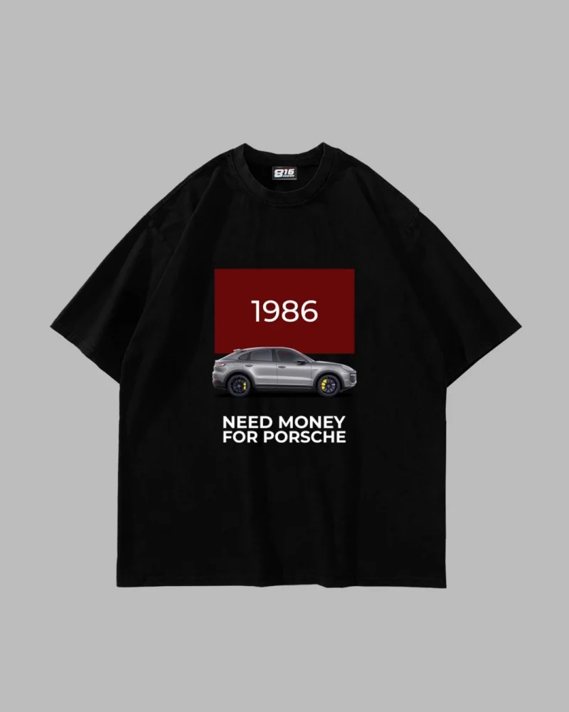 V2 Need Money For Porsche Baskılı Oversize Unisex Siyah Tshirt