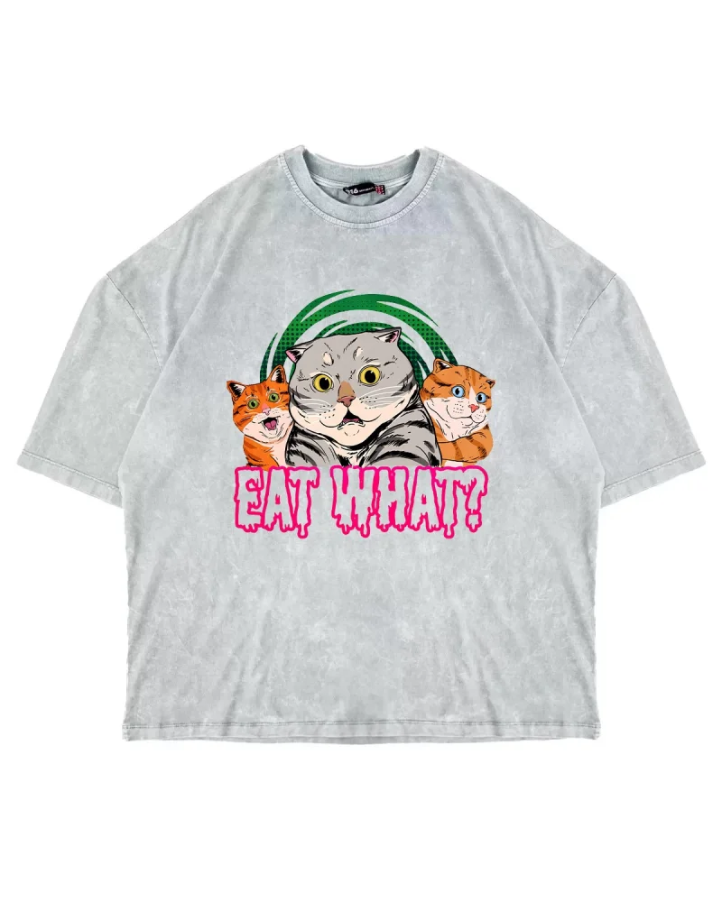Eat What Cat Baskılı Oversize Unisex Yıkamalı Beyaz Tshirt