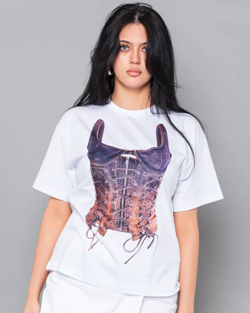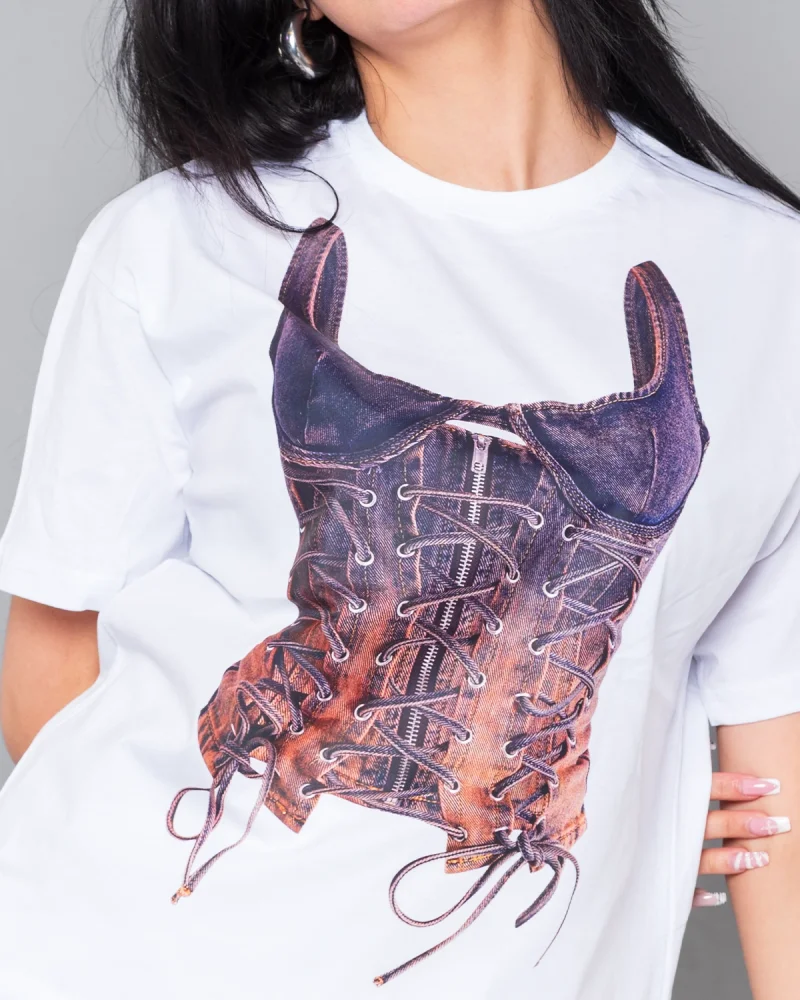 Denim Corset Baskılı Relaxed Fit Beyaz Kadın Tshirt