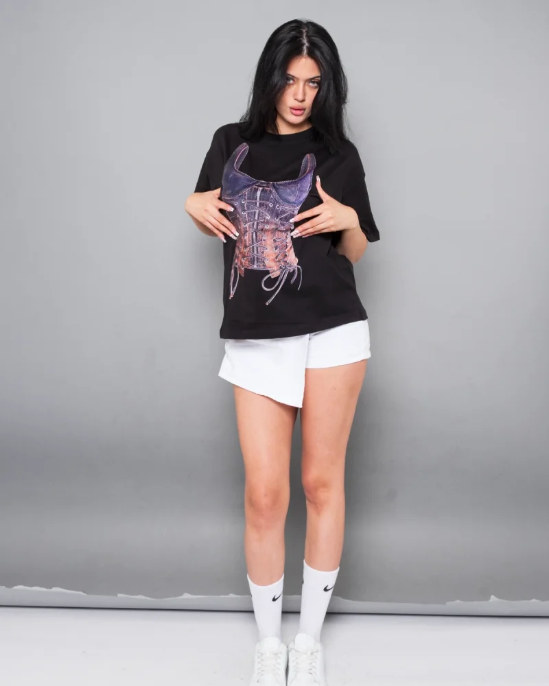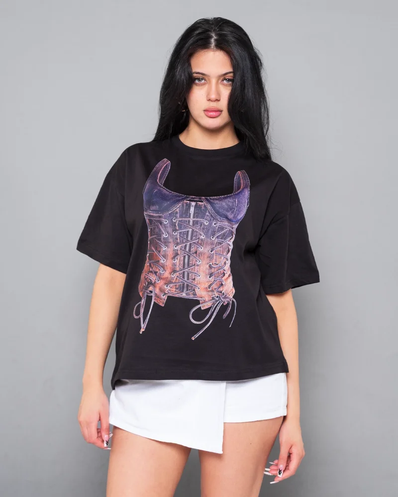 Denim Corset Baskılı Relaxed Fit Siyah Kadın Tshirt