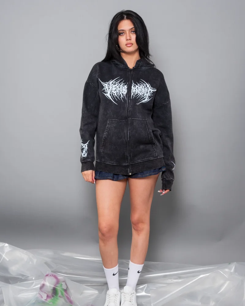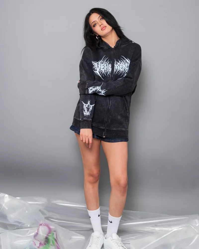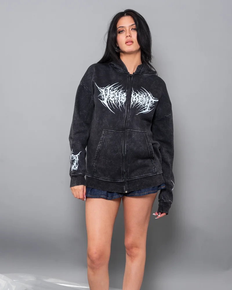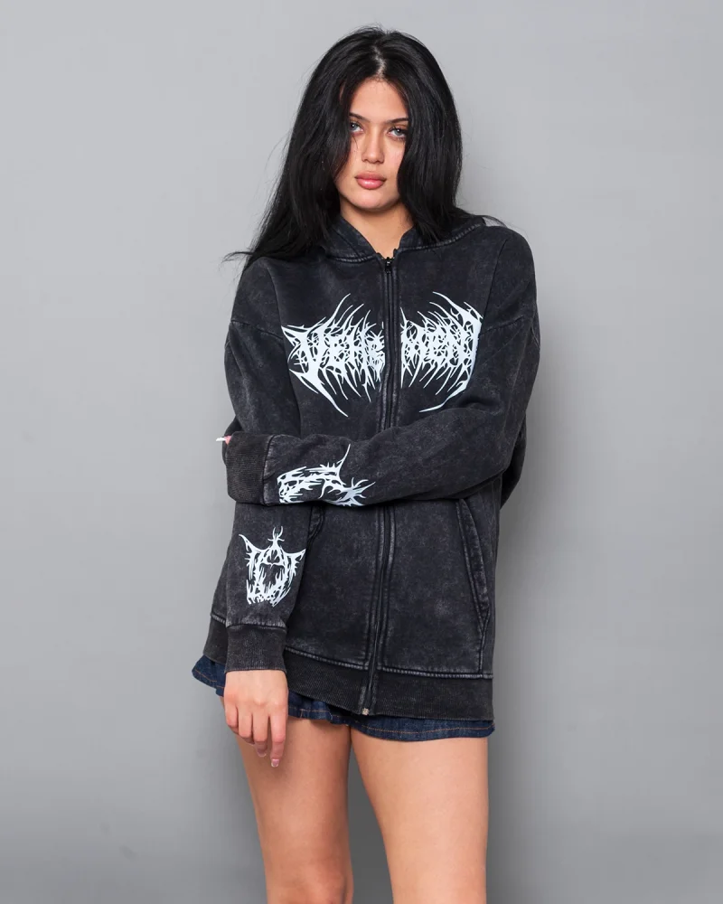 Vehement Baskılı Fermuarlı Kapüşonlu Zip Unisex Yıkamalı Siyah Sweatshirt