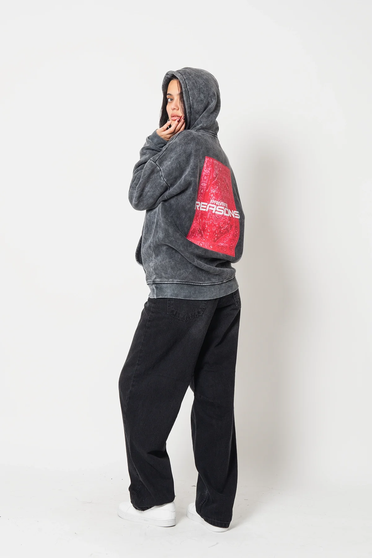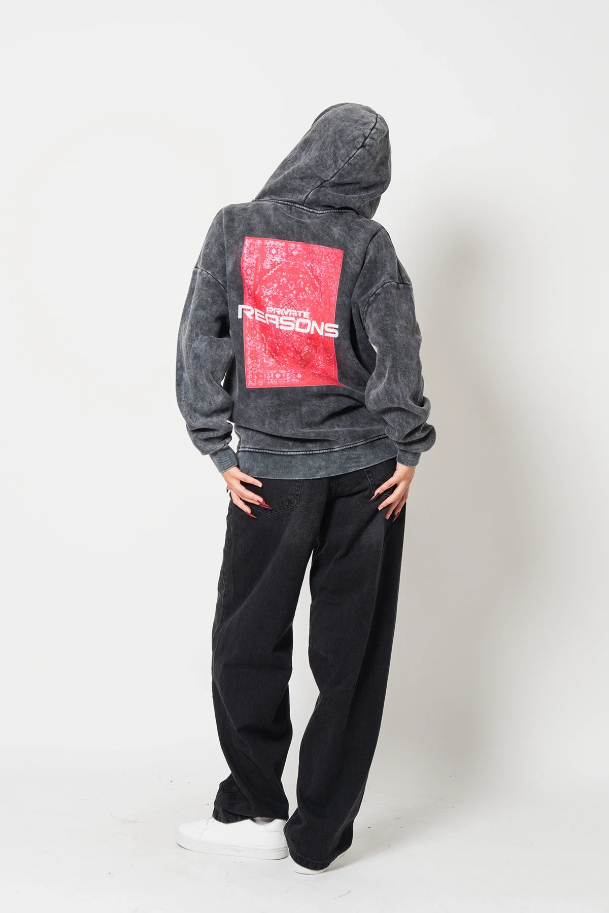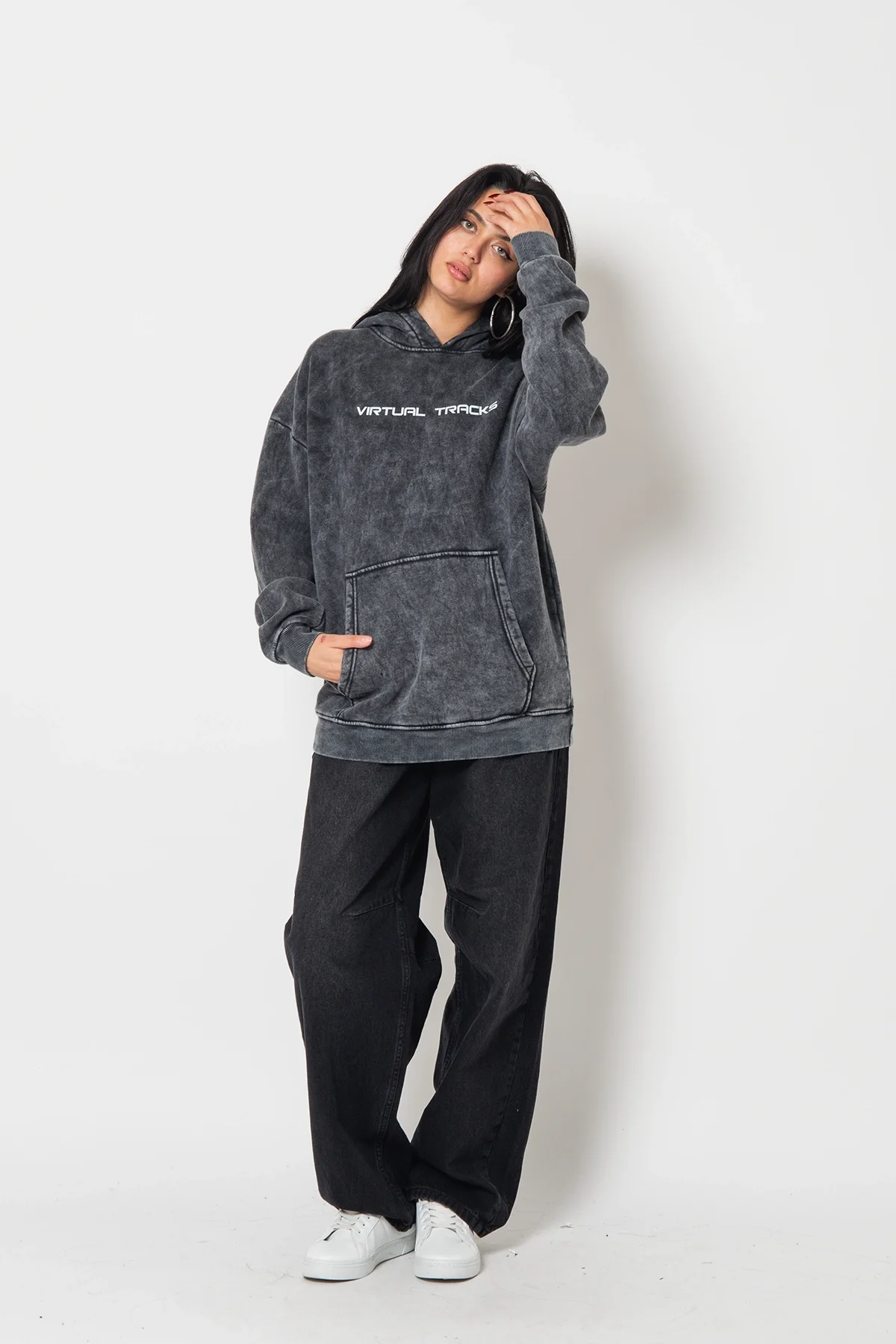 VIRTUAL TRACKS BASKILI OVERSİZE UNİSEX PREMİUM YIKAMALI SİYAH HOODİE