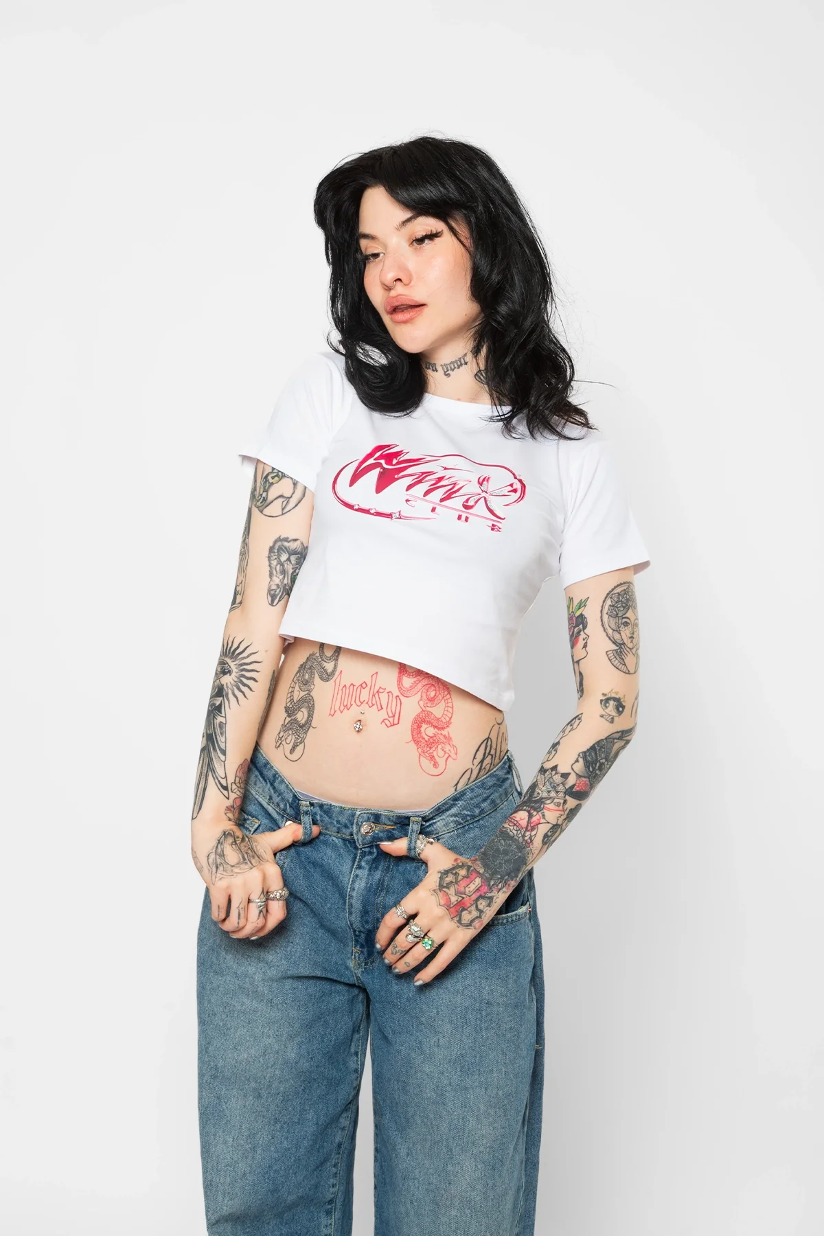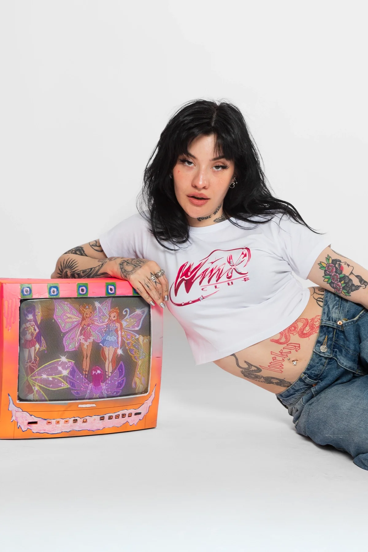 Bak Moda'nın yepyeni Wnx Club baskılı beyaz crop top'u ile stilinizi konuşturun! Bu crop top ile tarzınıza eğlenceli ve şirin bir dokunuş ekleyebilirsiniz.