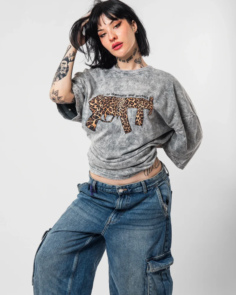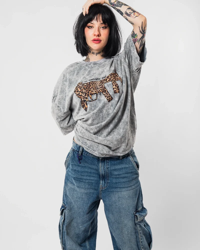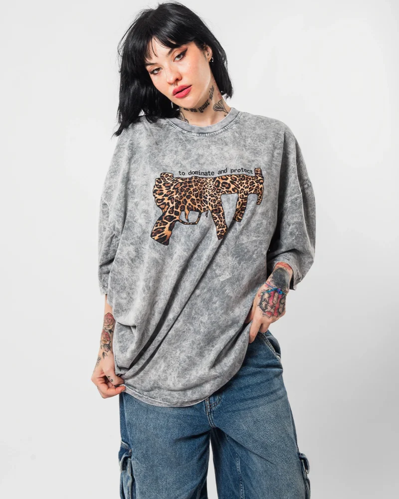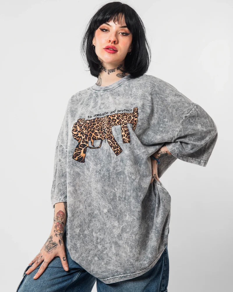 Starz Leopar Baskılı 24/1 Oversize Unisex Yıkamalı Siyah Tshirt