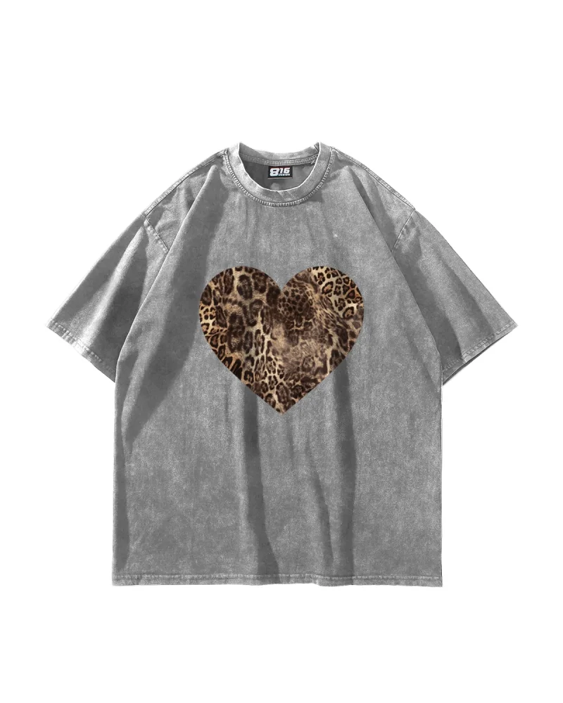Kalp Leopar Baskılı 24/1 Oversize Unisex Yıkamalı Beyaz Tshirt