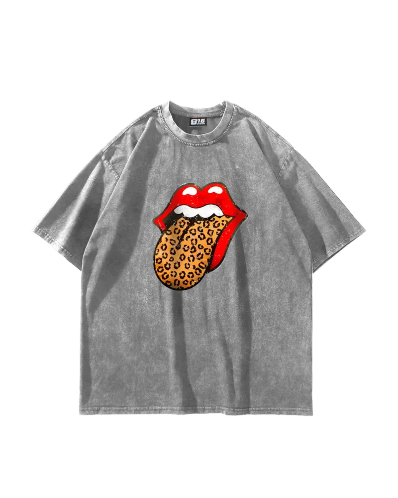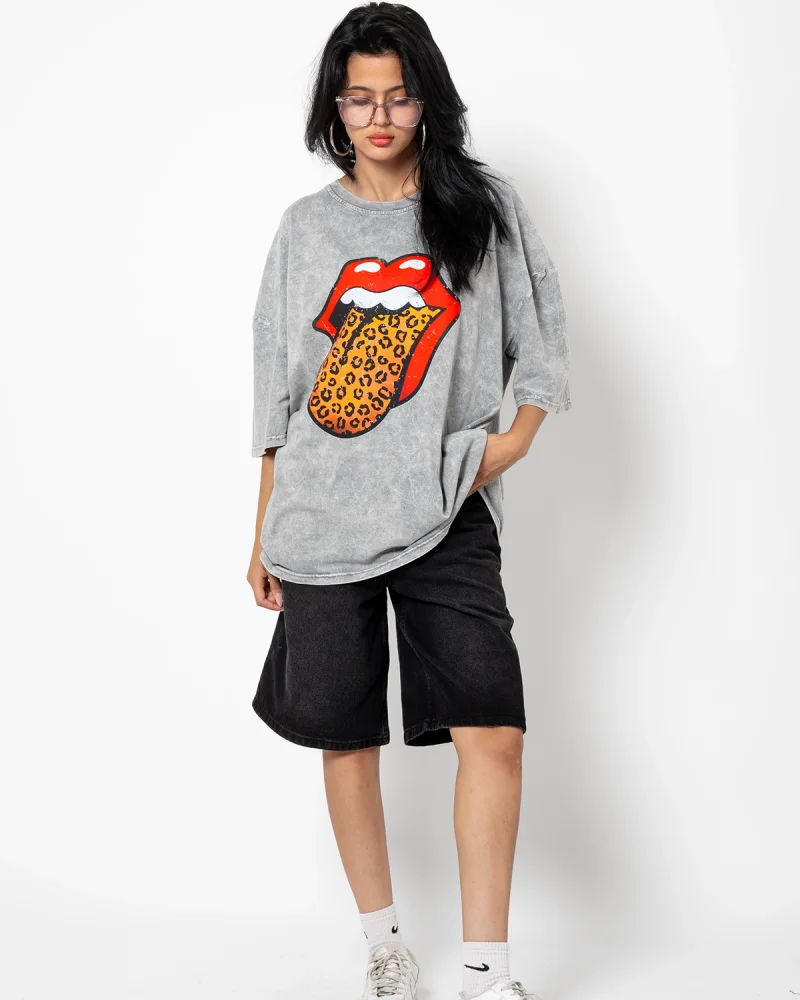 Rolling Stones Leopar Baskılı Oversize Unisex Premium Yıkamalı Beyaz Tshirt