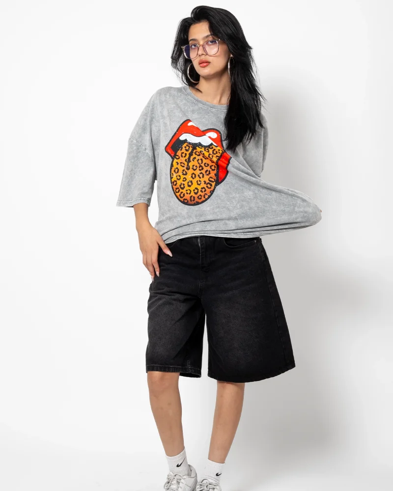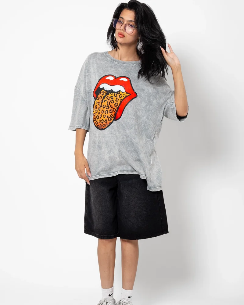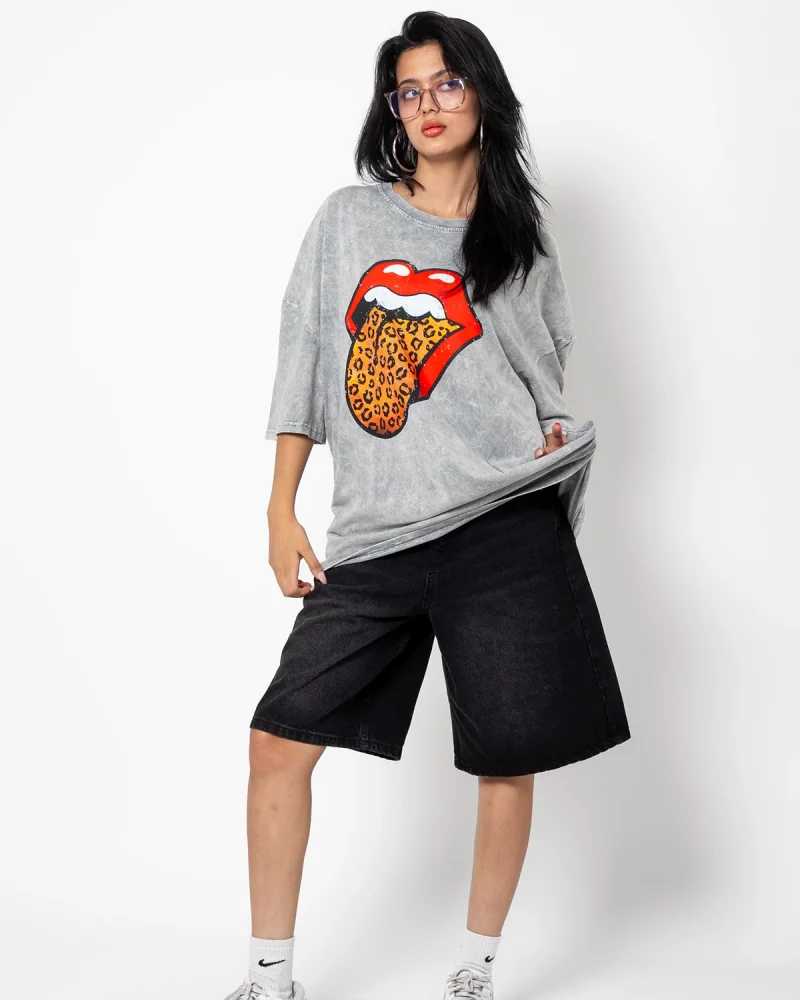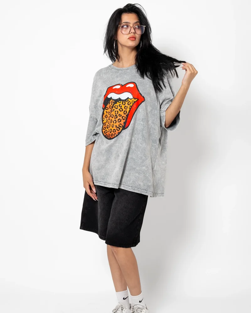 Rolling Stones Leopar Baskılı Oversize Unisex Premium Yıkamalı Siyah Tshirt