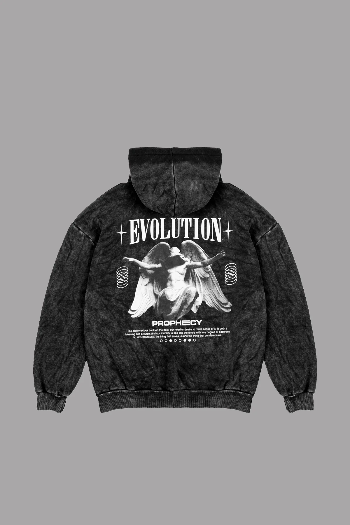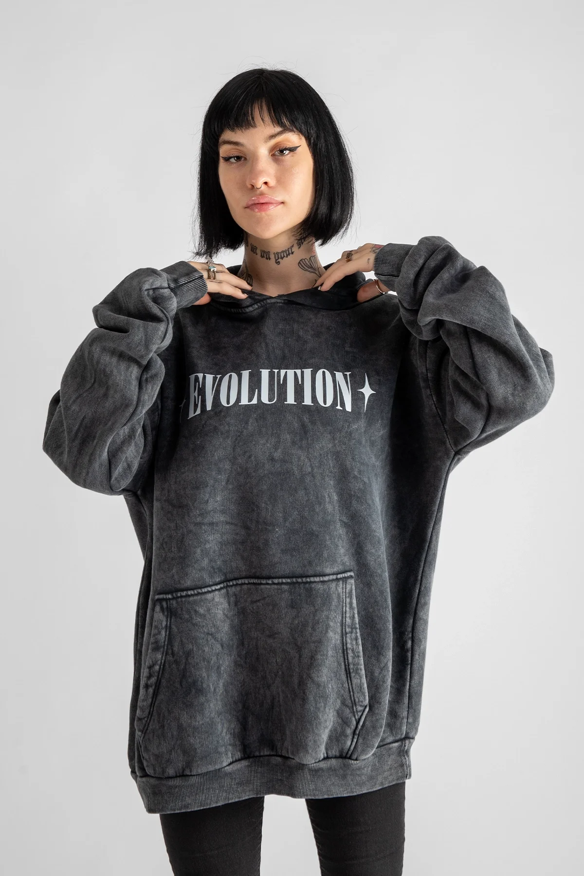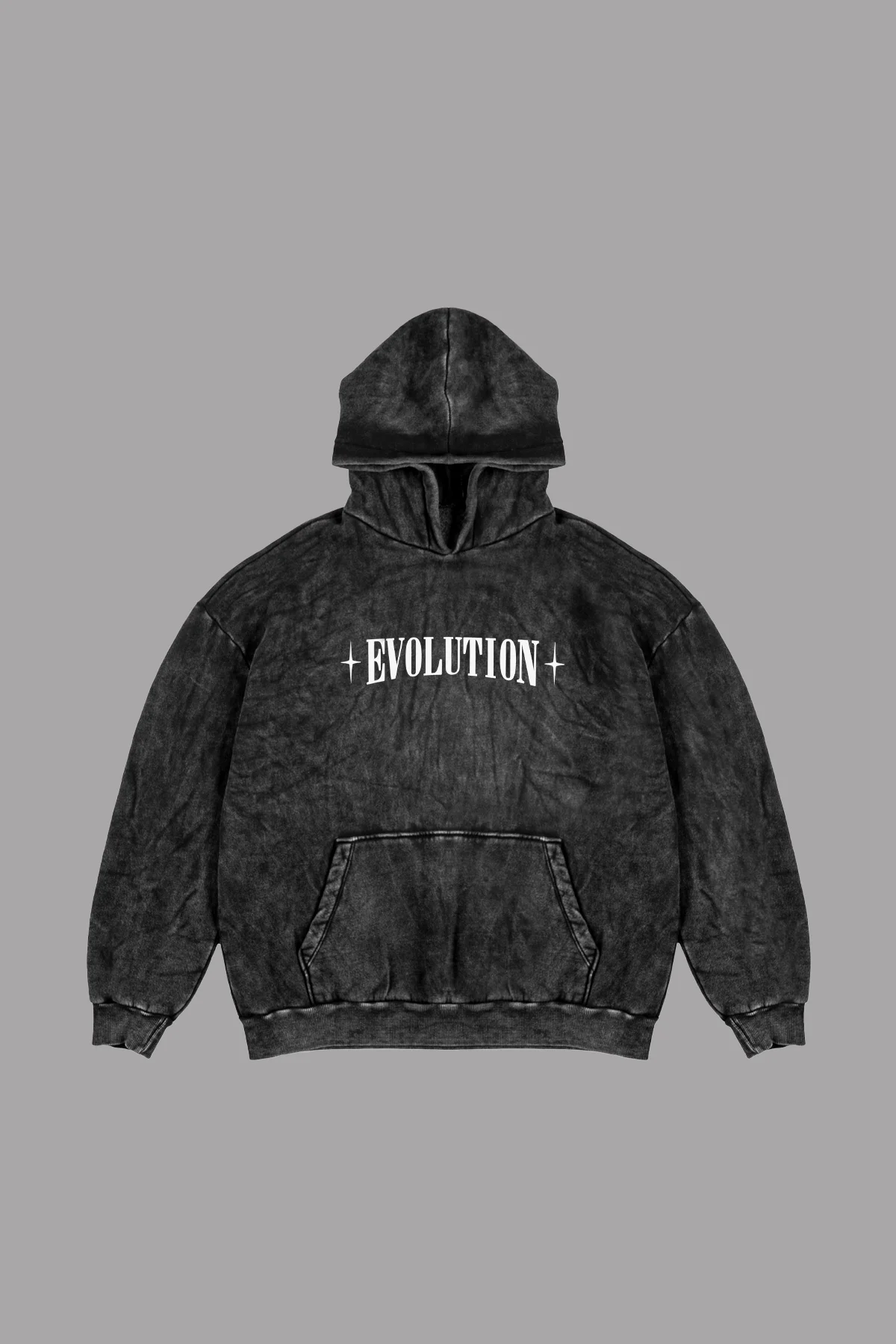 YIKAMALI EVOLUTİON BASKILI OVERSİZE UNİSEX KAPÜŞONLU SİYAH HOODİE