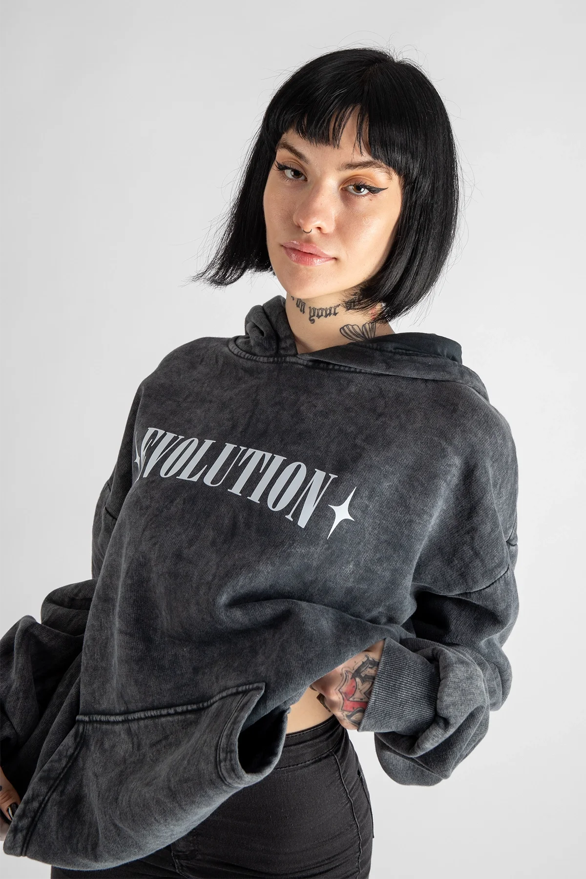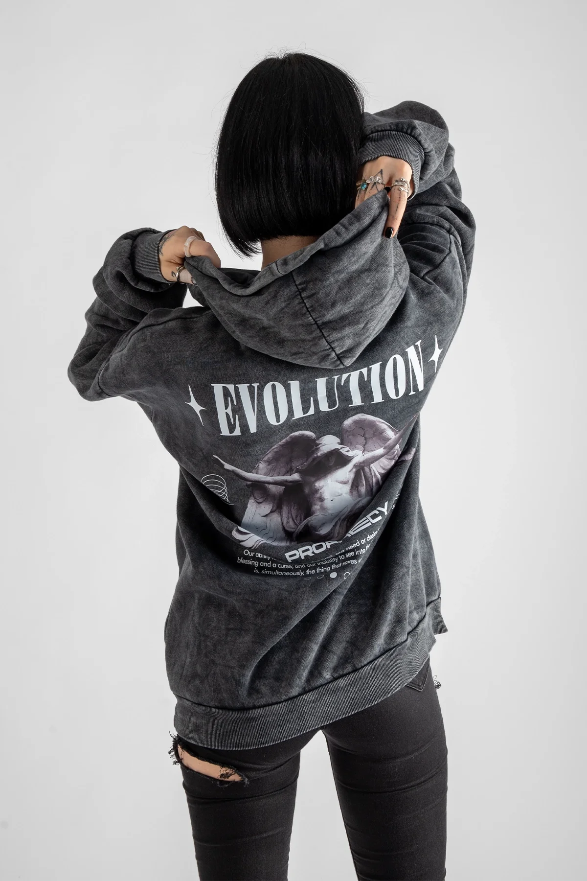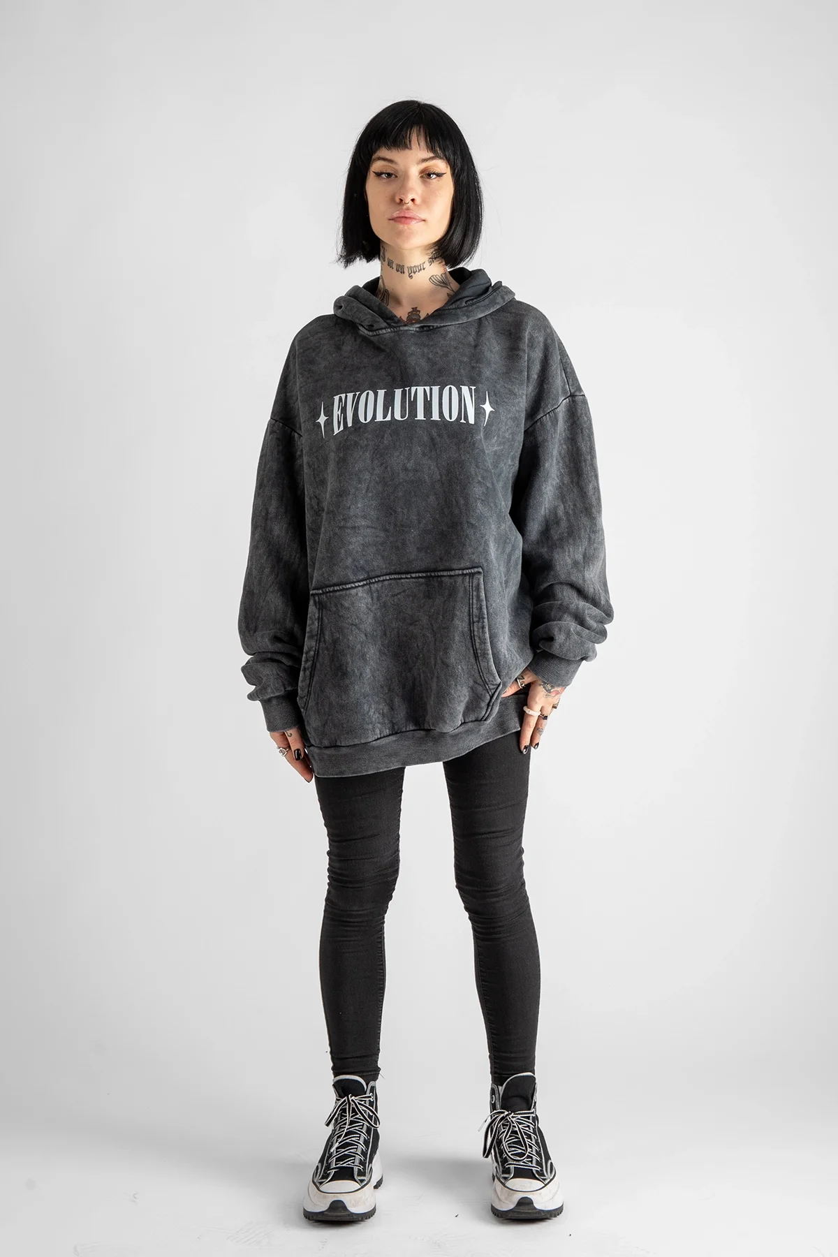 YIKAMALI EVOLUTİON BASKILI OVERSİZE UNİSEX KAPÜŞONLU SİYAH HOODİE