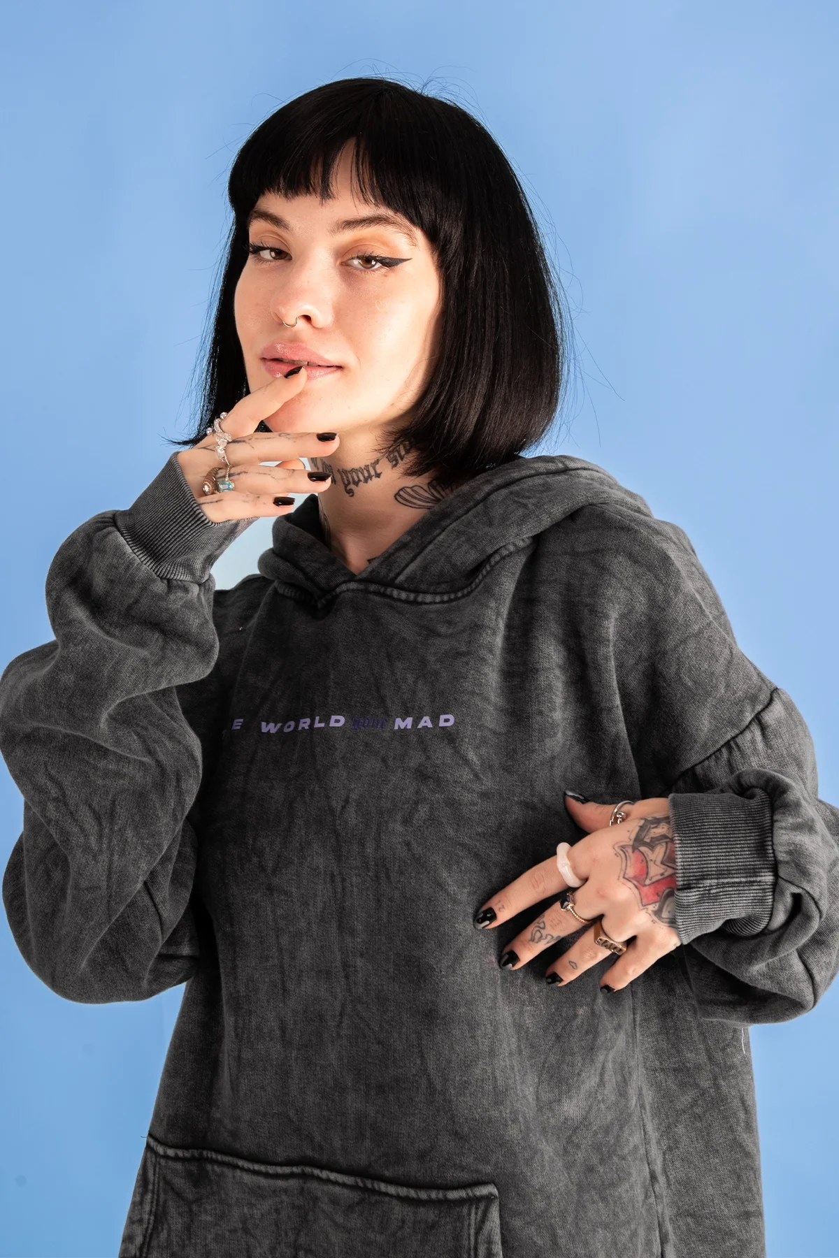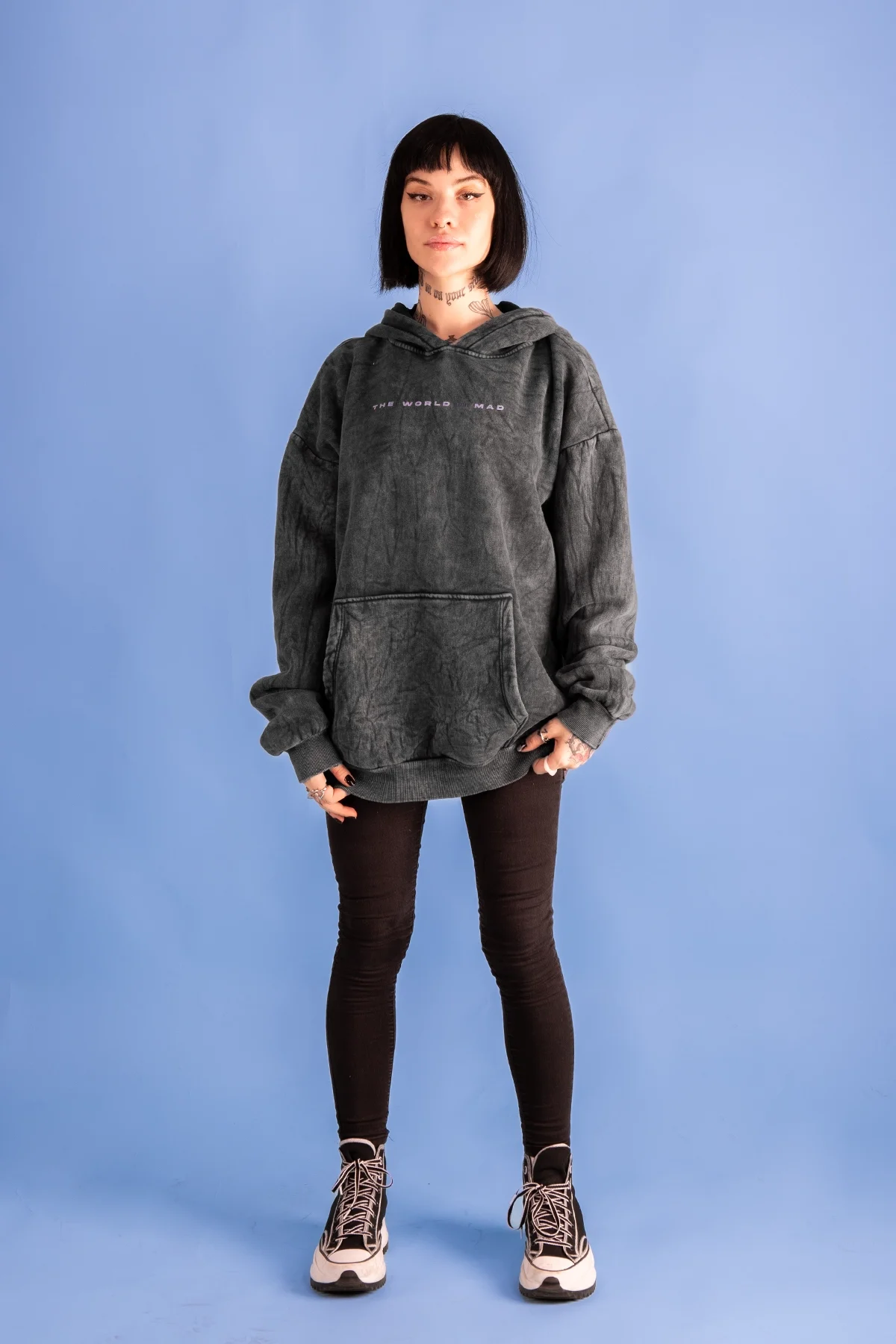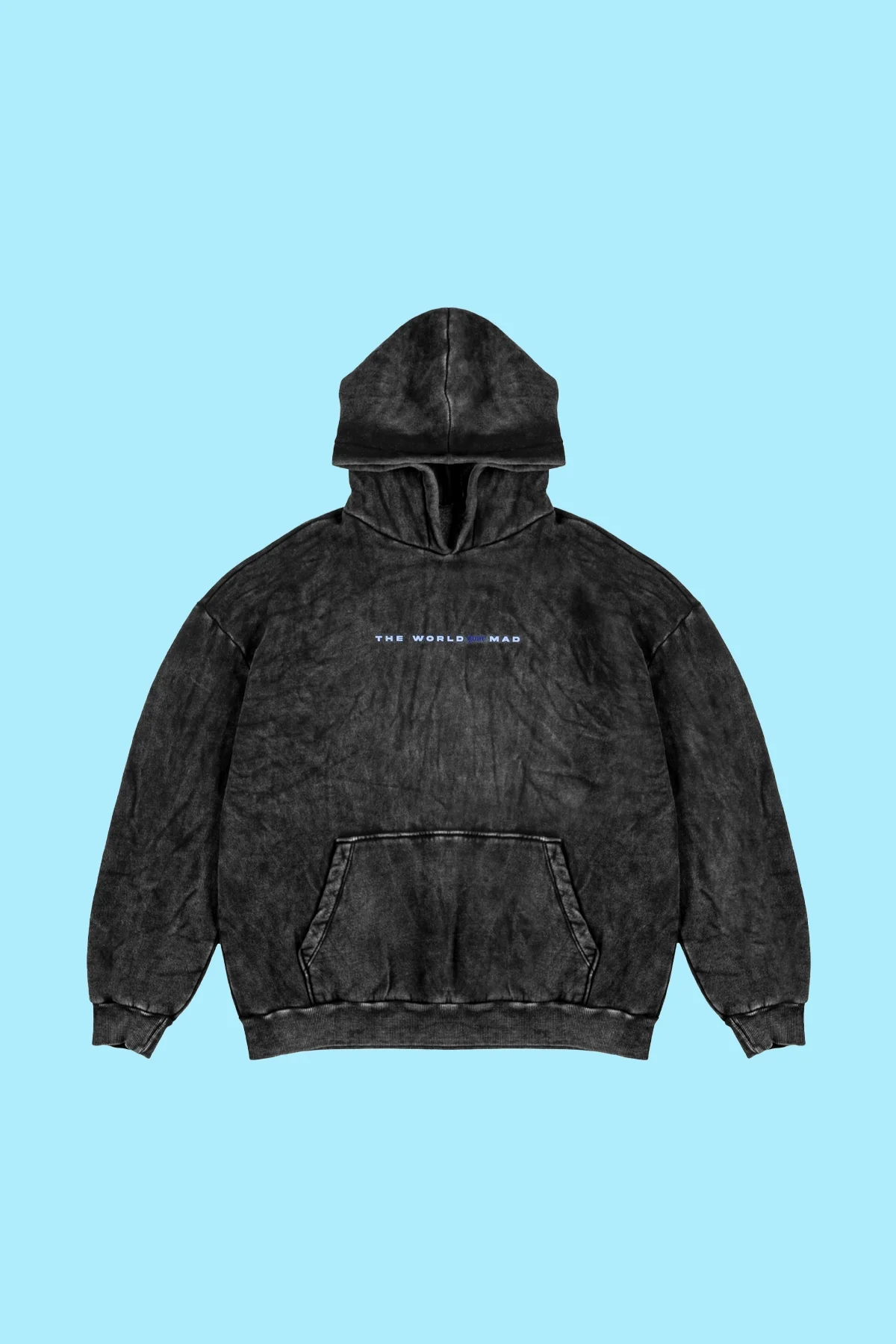 Angel Stitch Baskılı Oversize Unisex Yıkamalı Siyah Hoodie