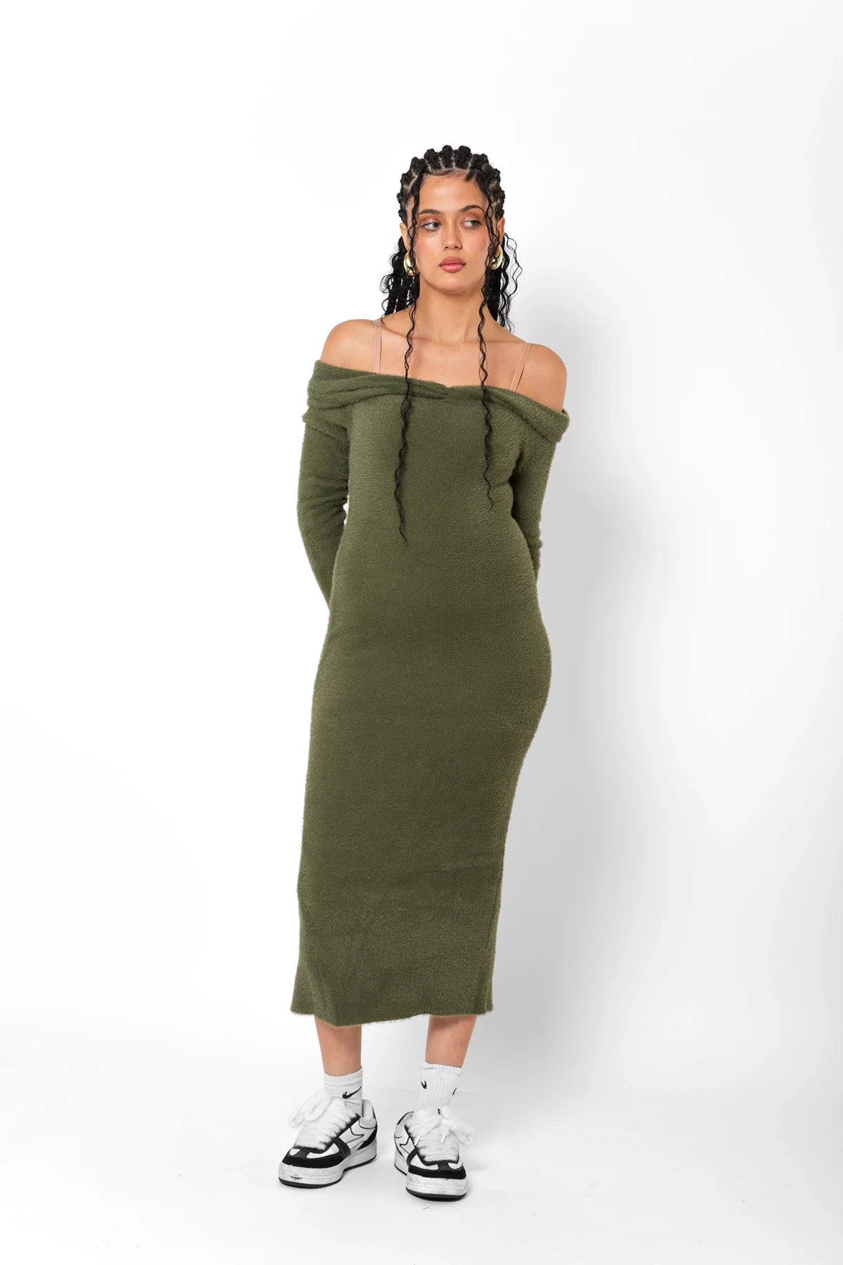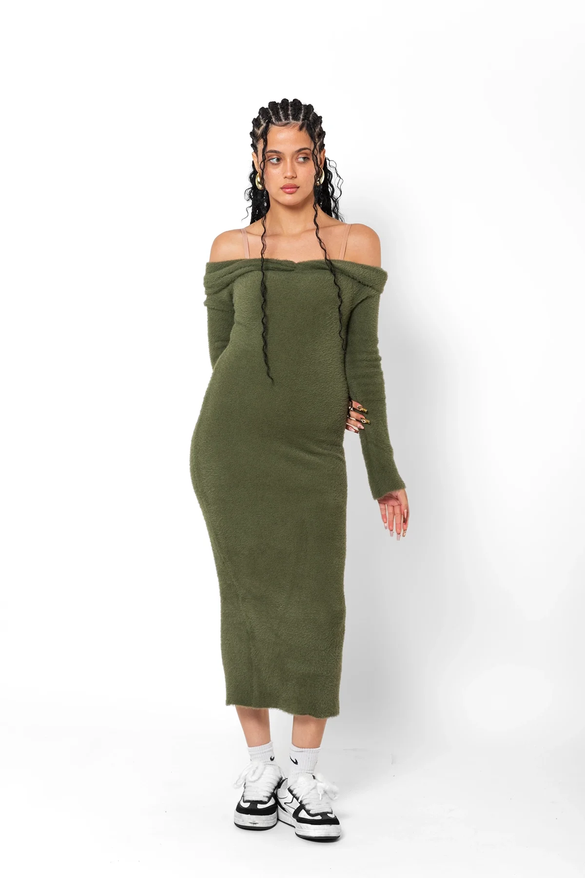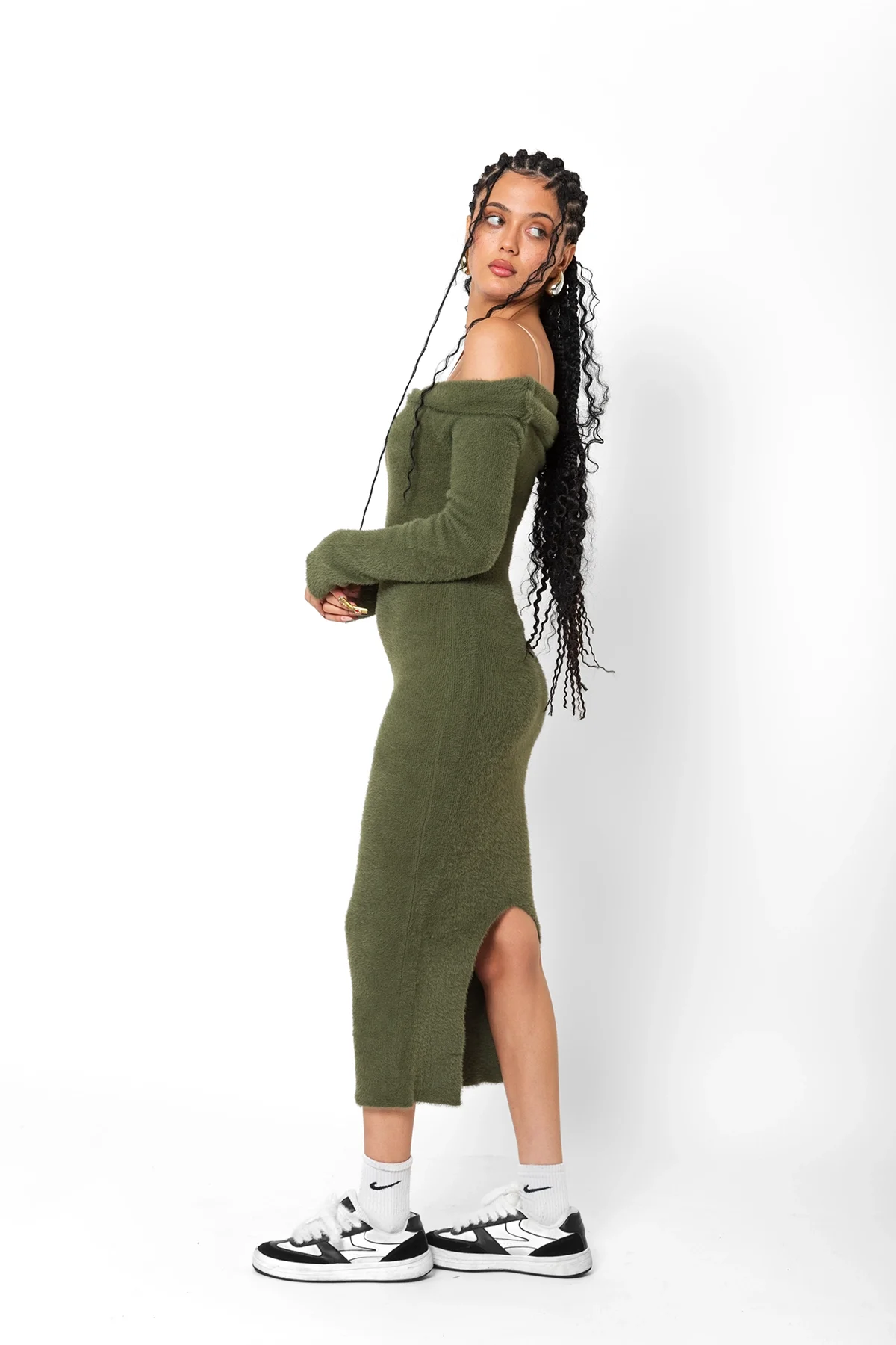 AÇIK OMUZLU YIRTMAÇ DETAYLI YEŞİL PELUŞ ELBİSE