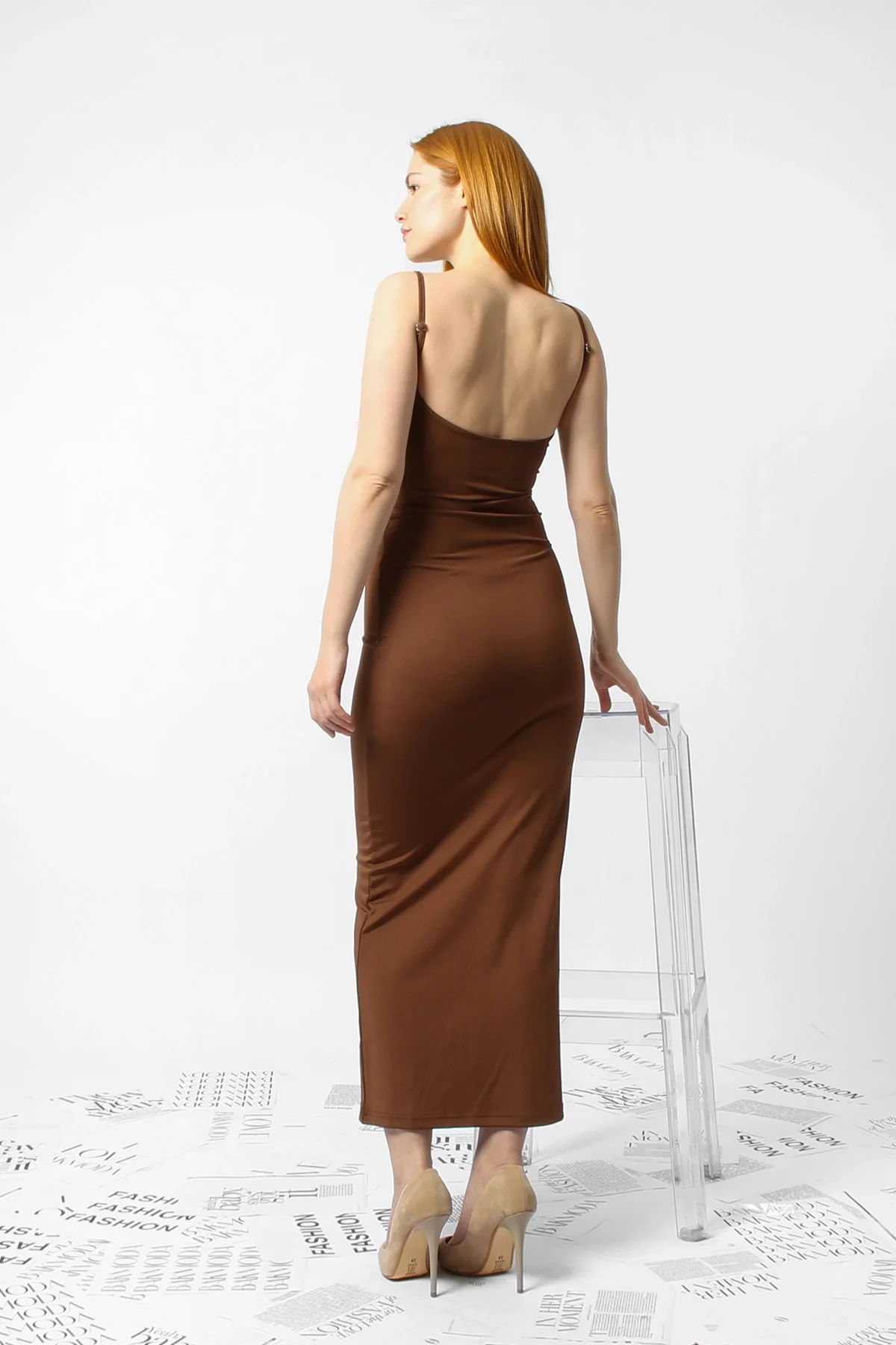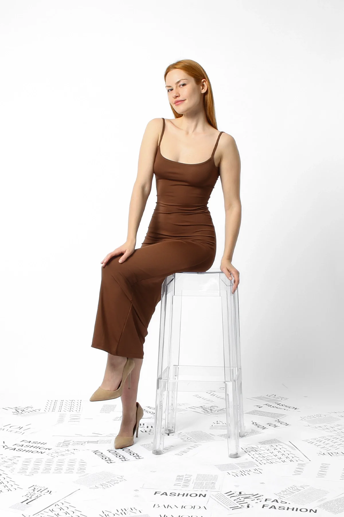 AYAR ASKILI DALGIÇ KUMAŞ MİDİ BOY KAHVERENGİ BASİC ELBİSE