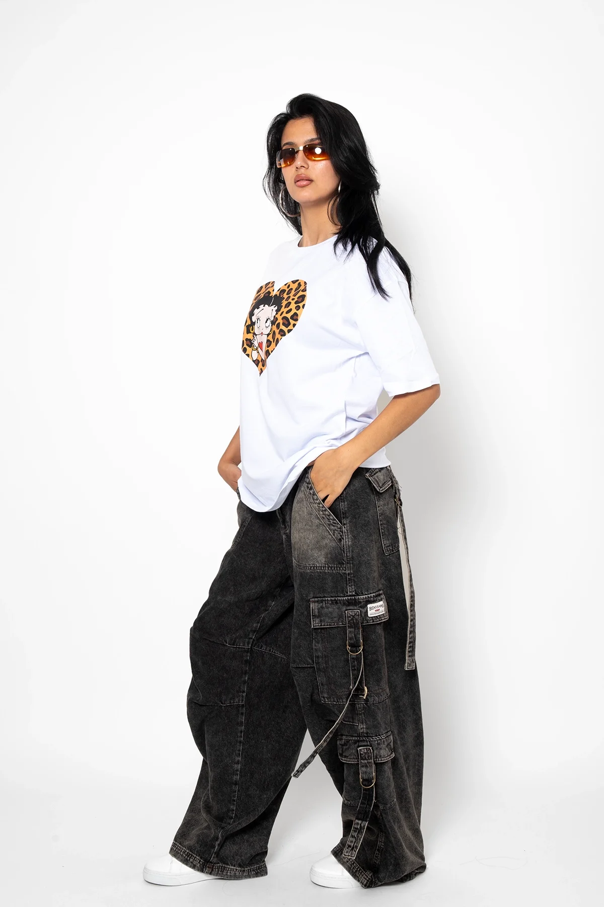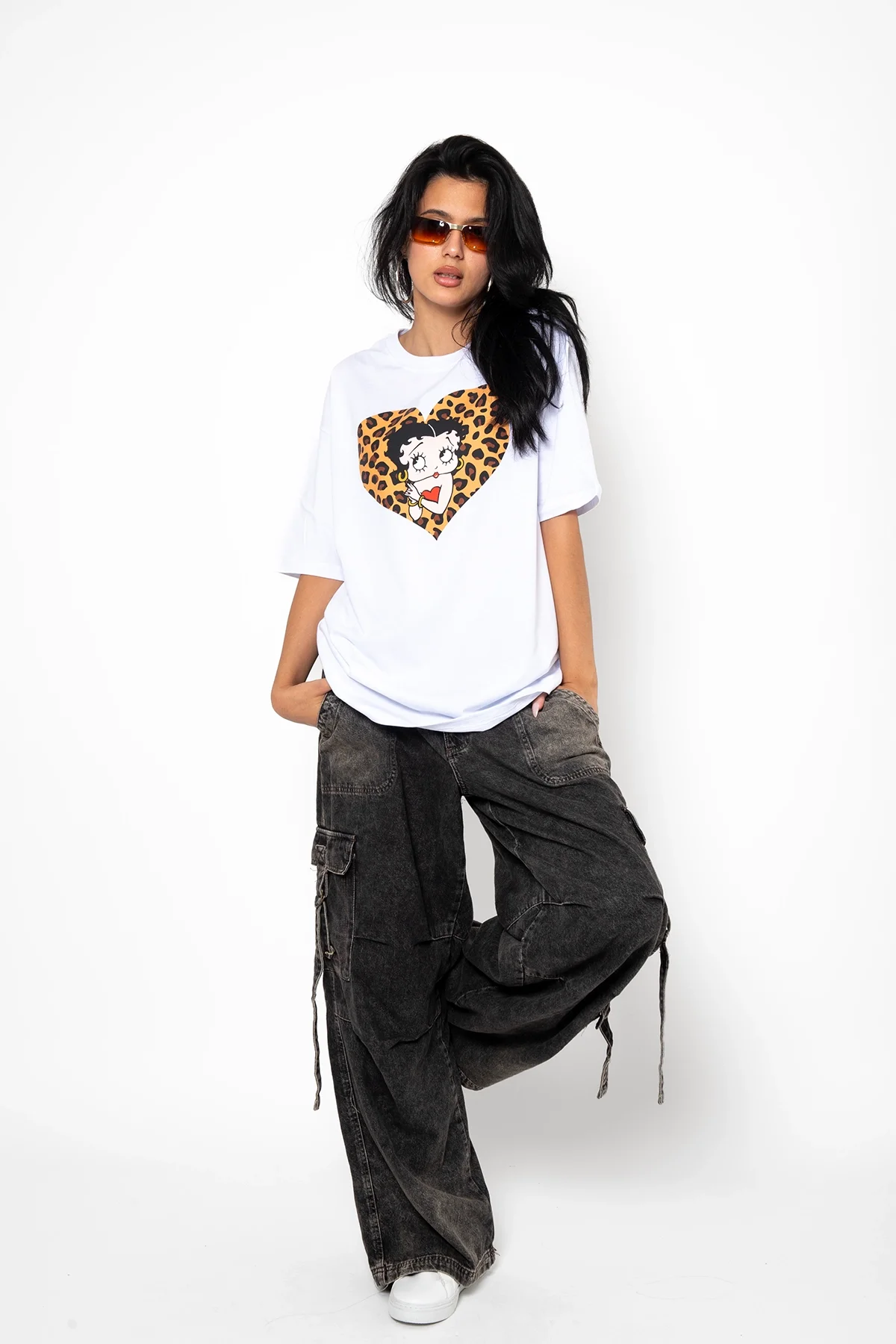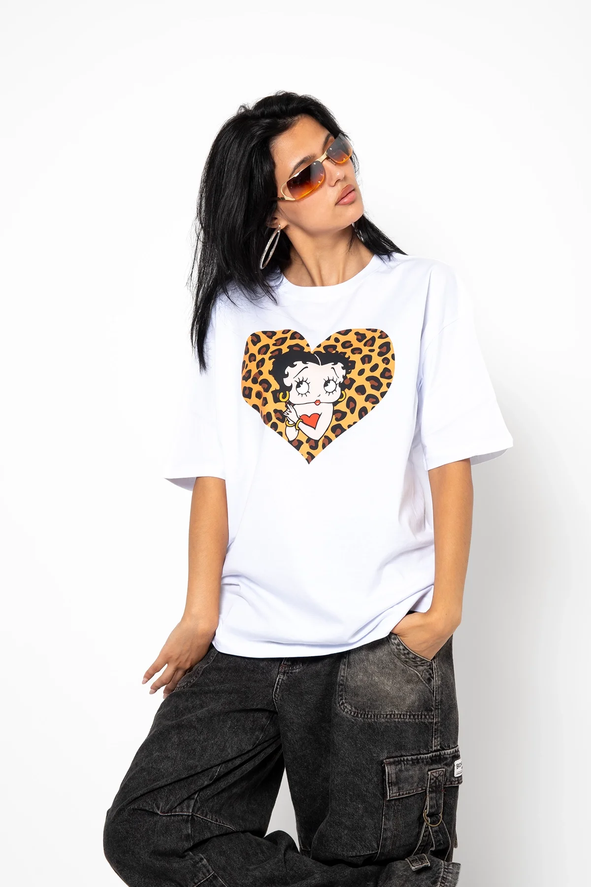 B. BOOPS LEOPAR BASKILI OVERSİZE UNİSEX PREMİUM BEYAZ TSHİRT