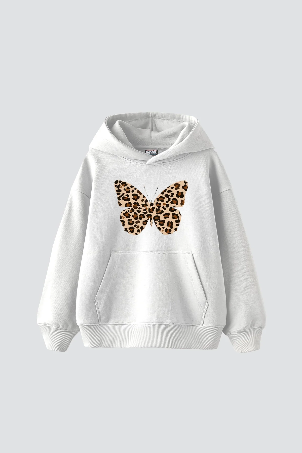 BUTTERFLY LEOPARD BASKILI OVERSİZE UNİSEX PREMİUM BEYAZ HOODİE