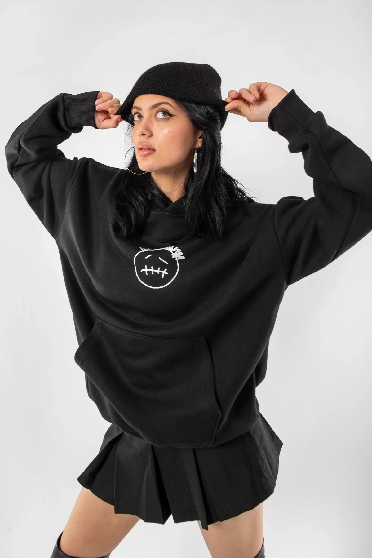 Angel Stitch Baskılı Oversize Unisex Siyah Hoodie