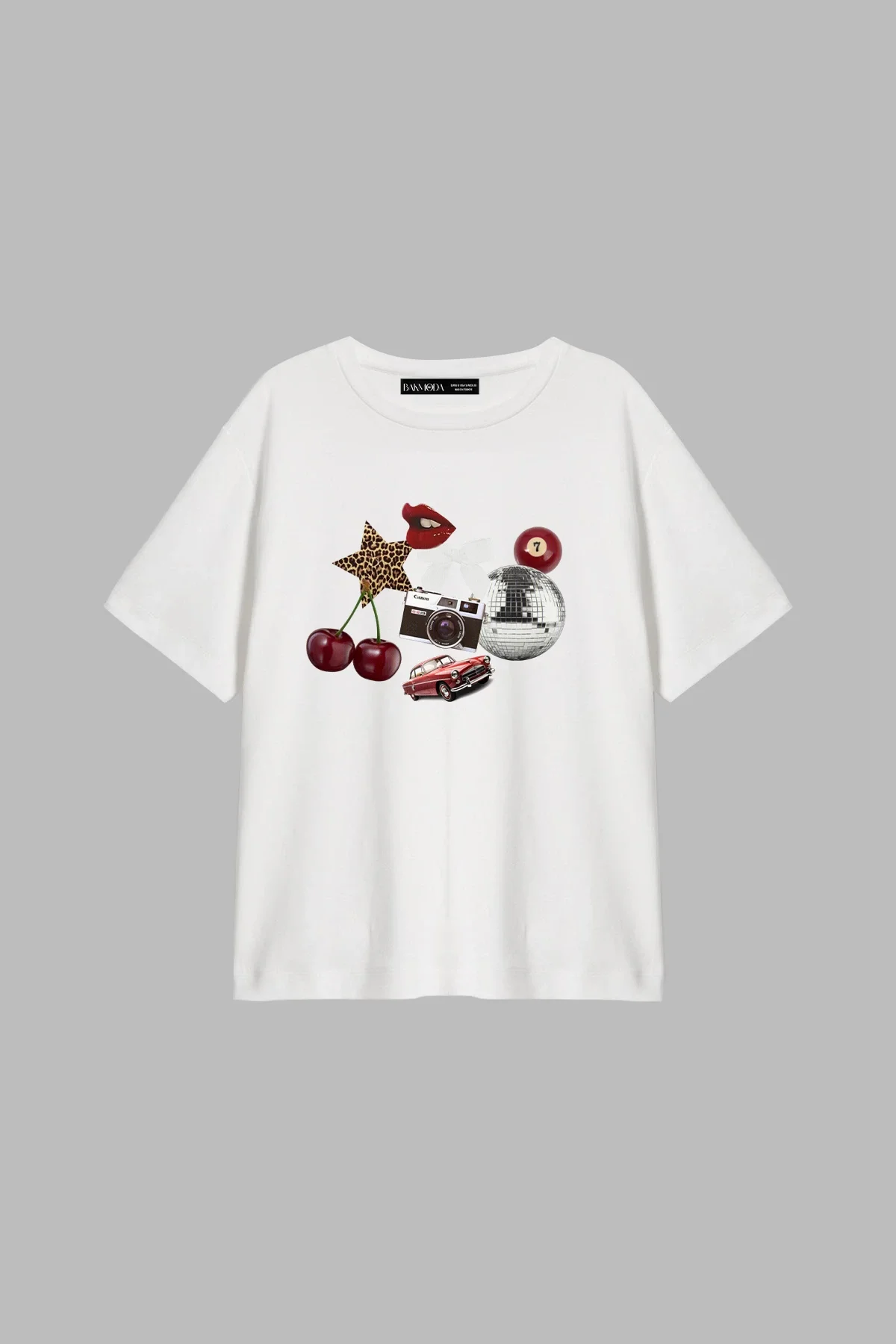Cherry & Disco Vibes Baskılı Relaxed Fit Beyaz Kadın Tshirt, Bak Moda'nın kendine özgü tasarımı ile stilinizi tamamlayacak mükemmel bir seçenektir.