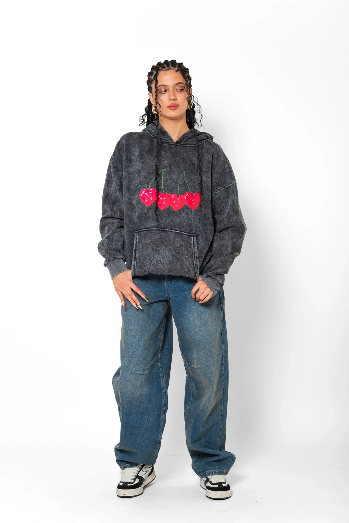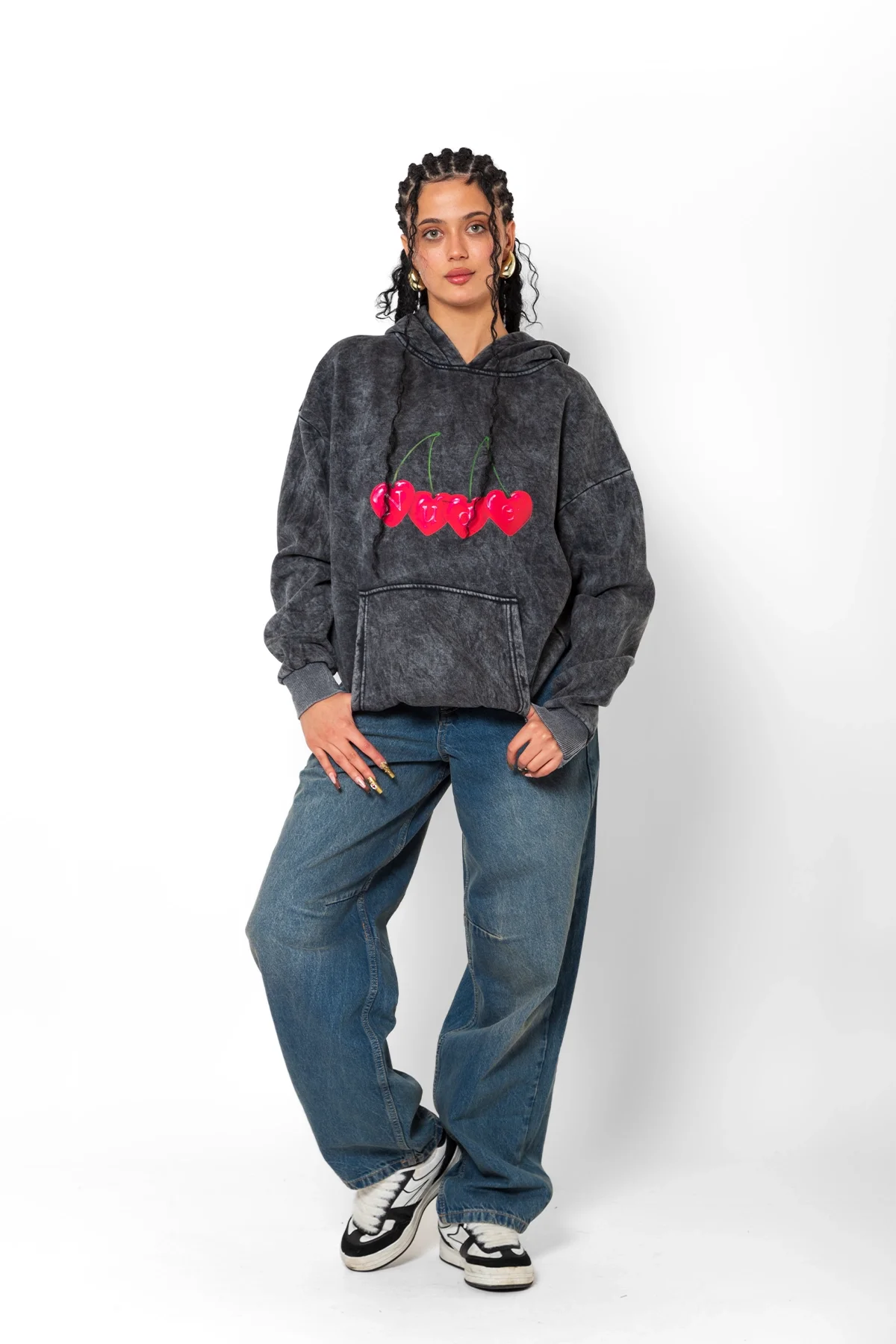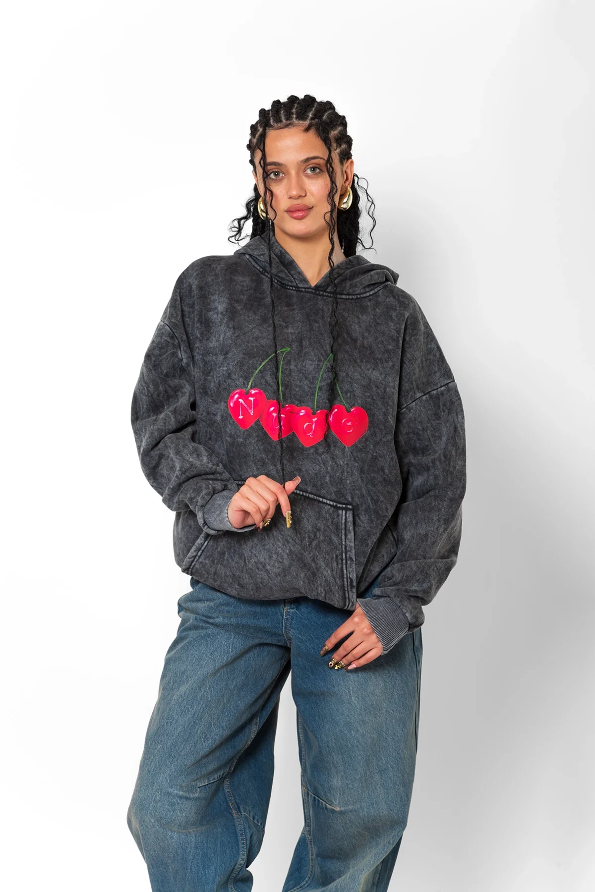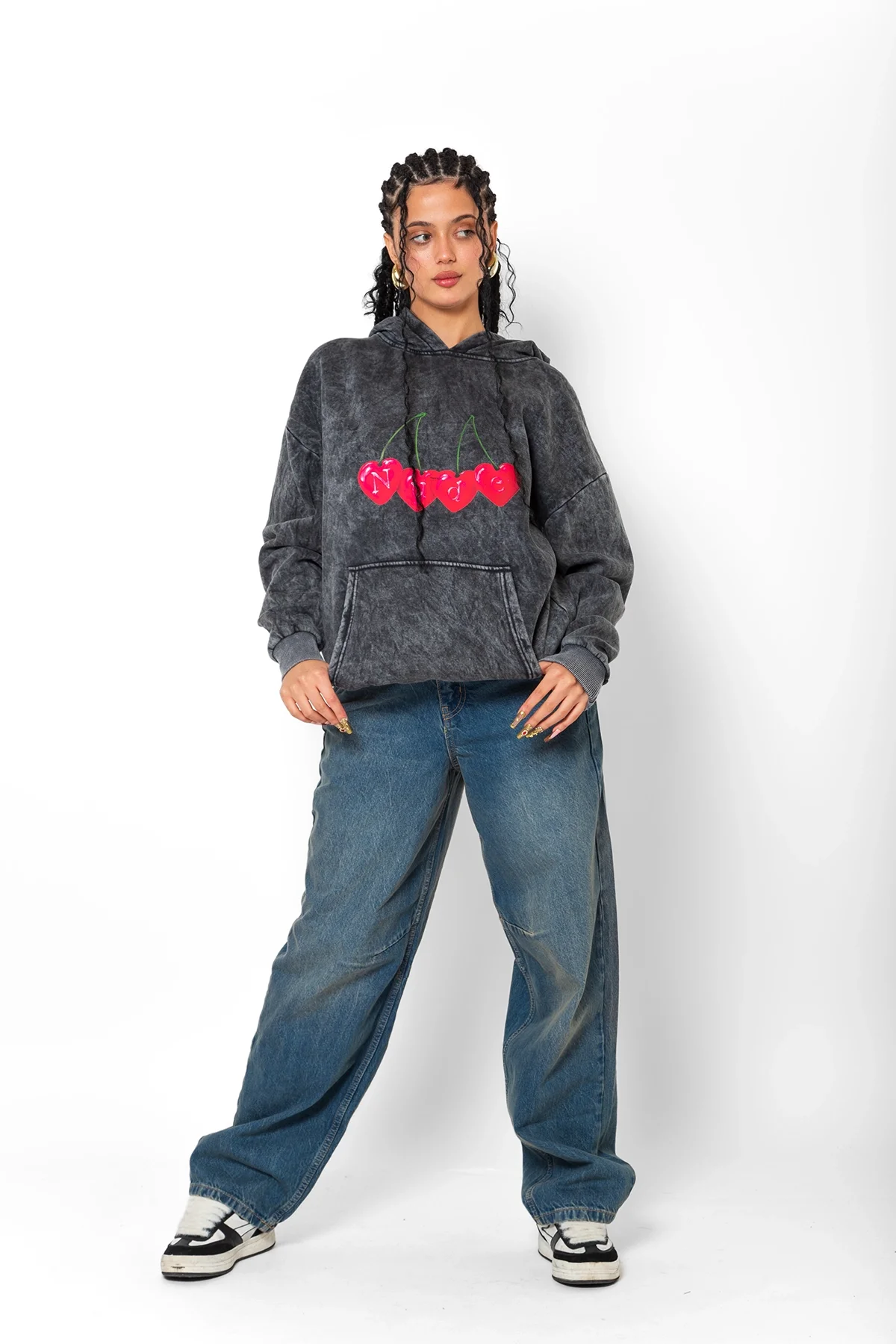 CHERRY NUDE BASKILI OVERSİZE UNİSEX PREMİUM YIKAMALI SİYAH HOODİE