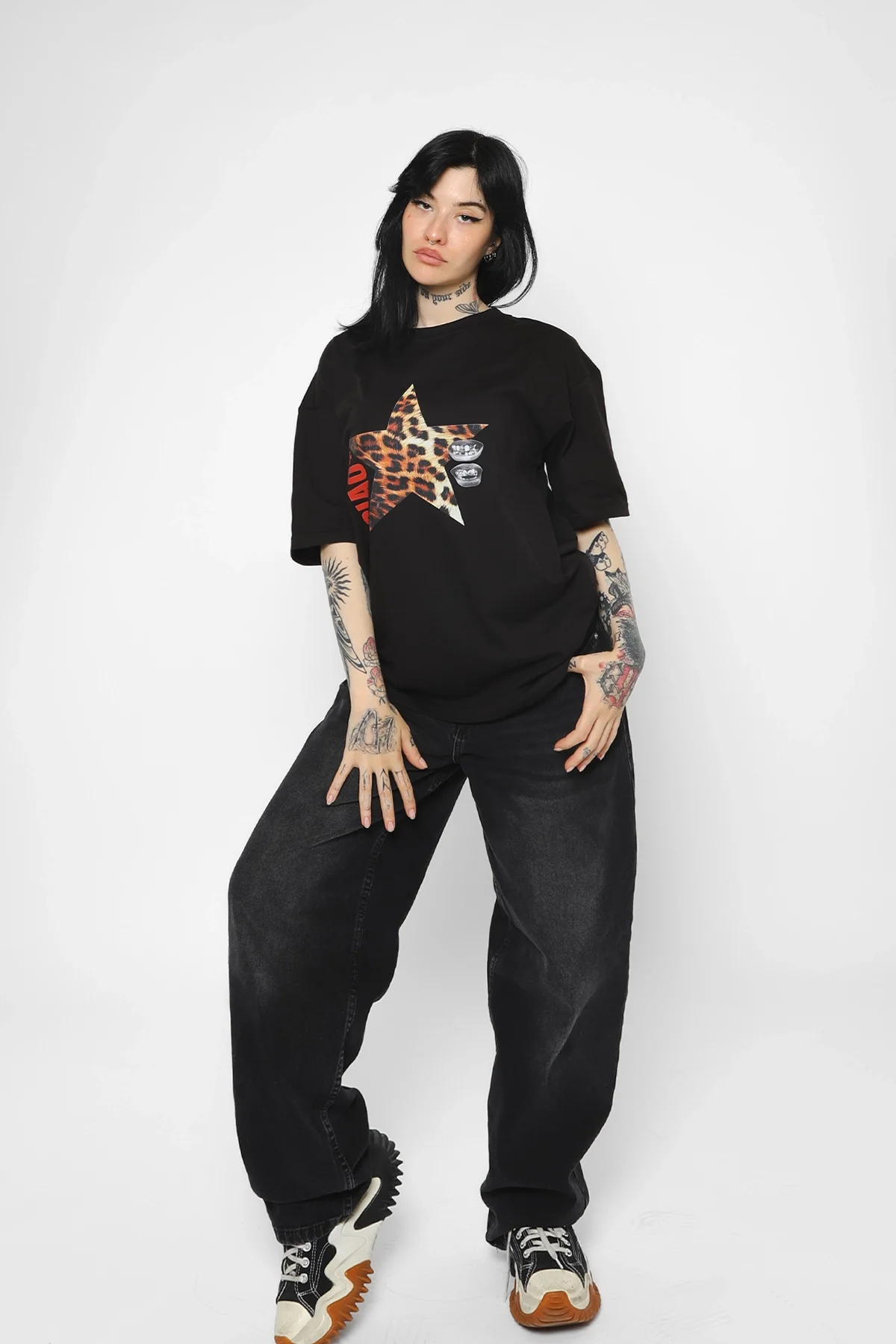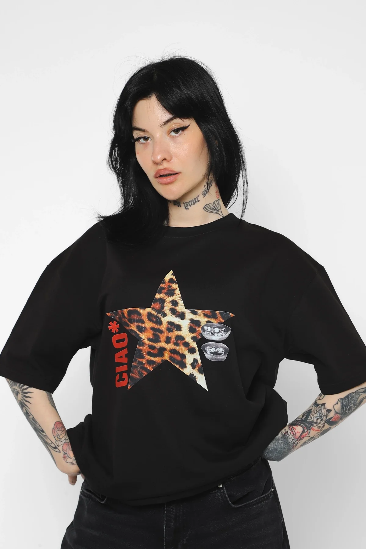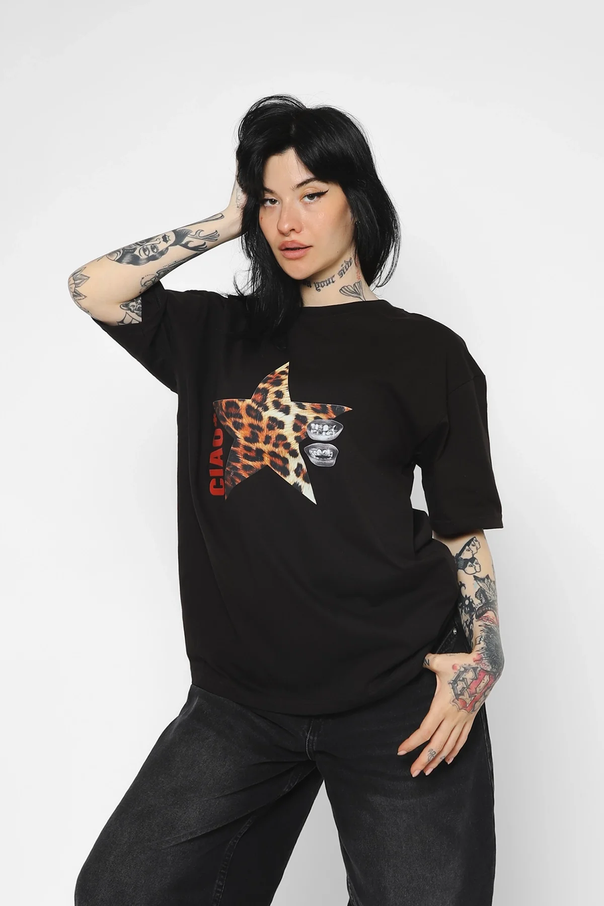 Ciao Yıldız Baskılı Oversize Unisex Siyah Tshirt, tarzınızı yansıtmak isteyenler için ideal bir seçenektir.