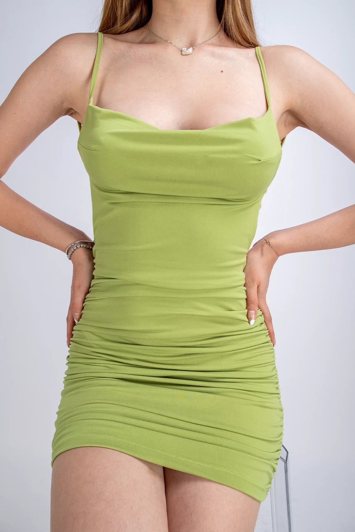Cesur ve zarif bir stil arayanlar için tasarlanan bu yeşil mini elbise, dikkat çekici detaylarıyla fark yaratıyor. Yumuşak dokulu kumaşıyla gün boyu konfor sağlarken, degaje yaka ve ince ip askıları feminen bir hava katıyor.