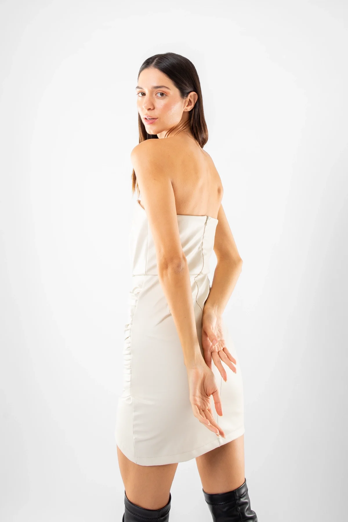 DERİ KORSE DETAYLI STRAPLEZ EKRU MİNİ ELBİSE