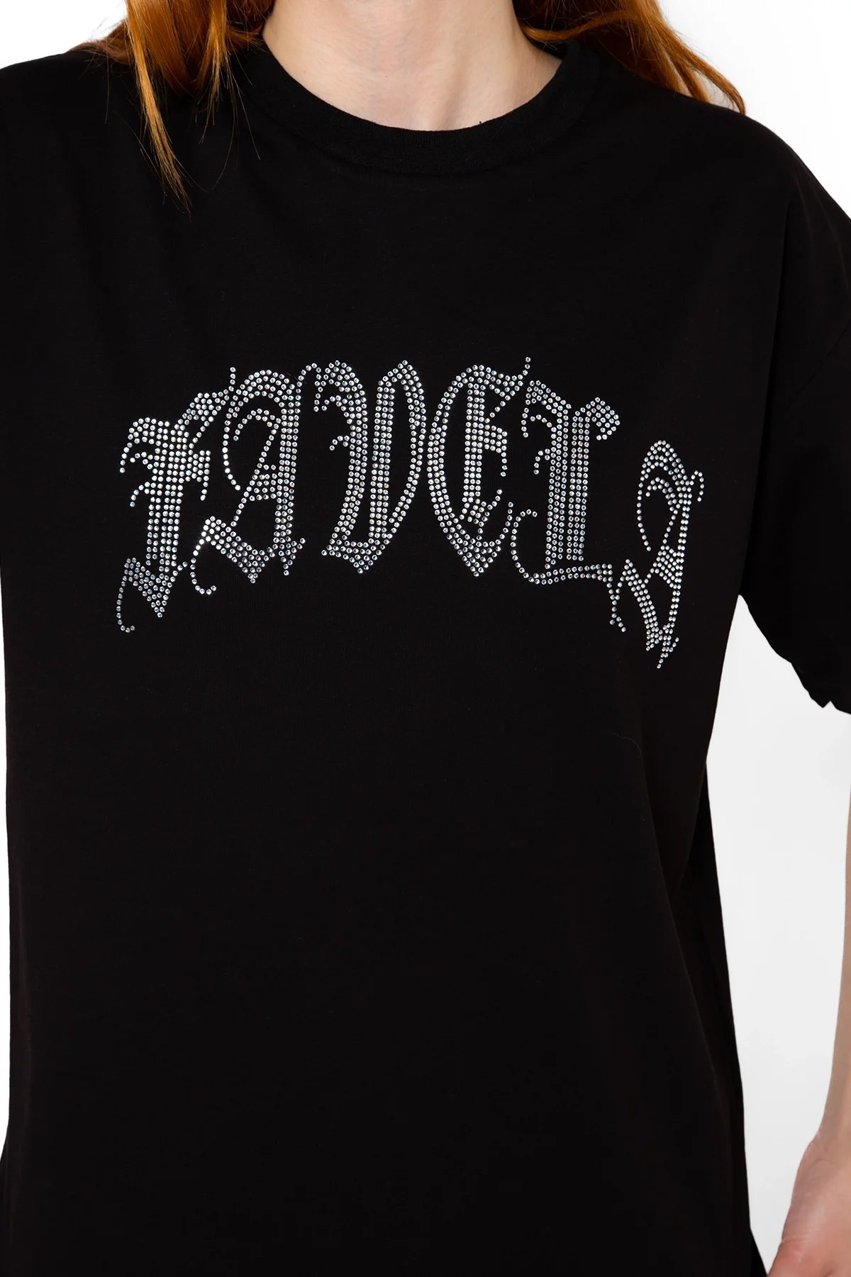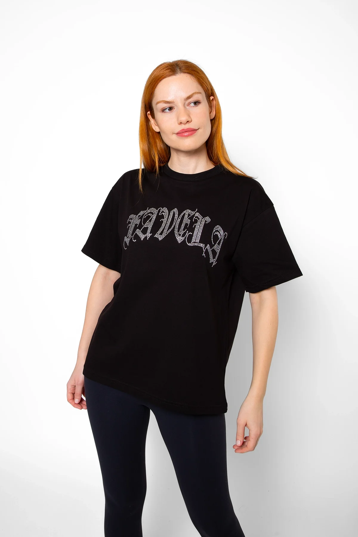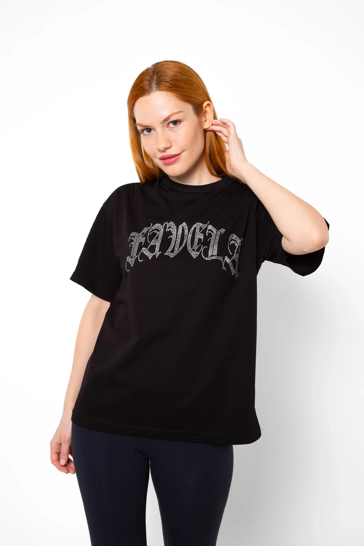 FAVELA TAŞ BASKILI RELAXED FİT SİYAH KADIN TSHİRT