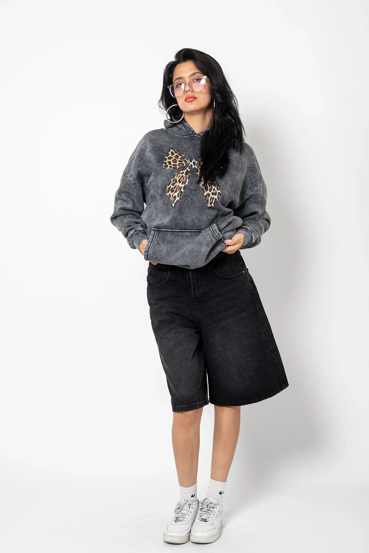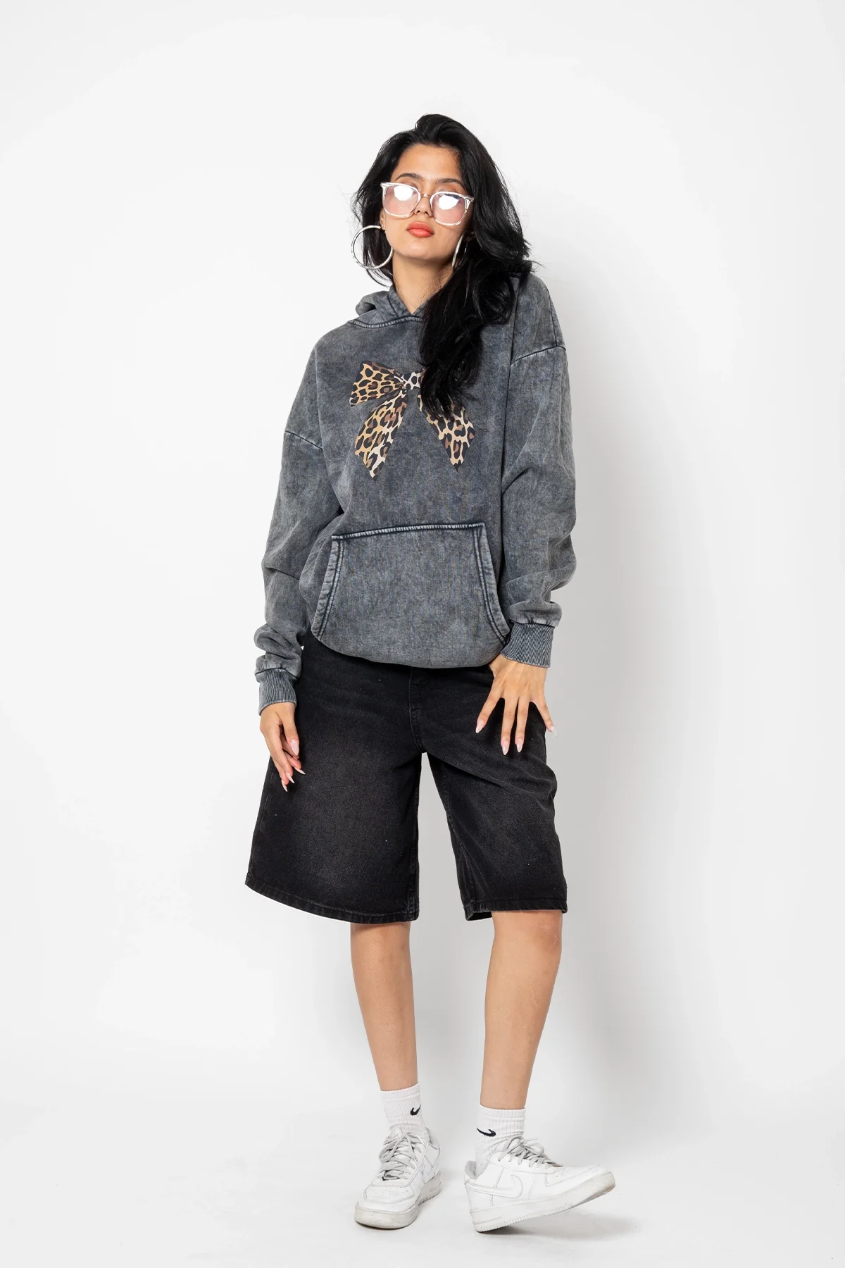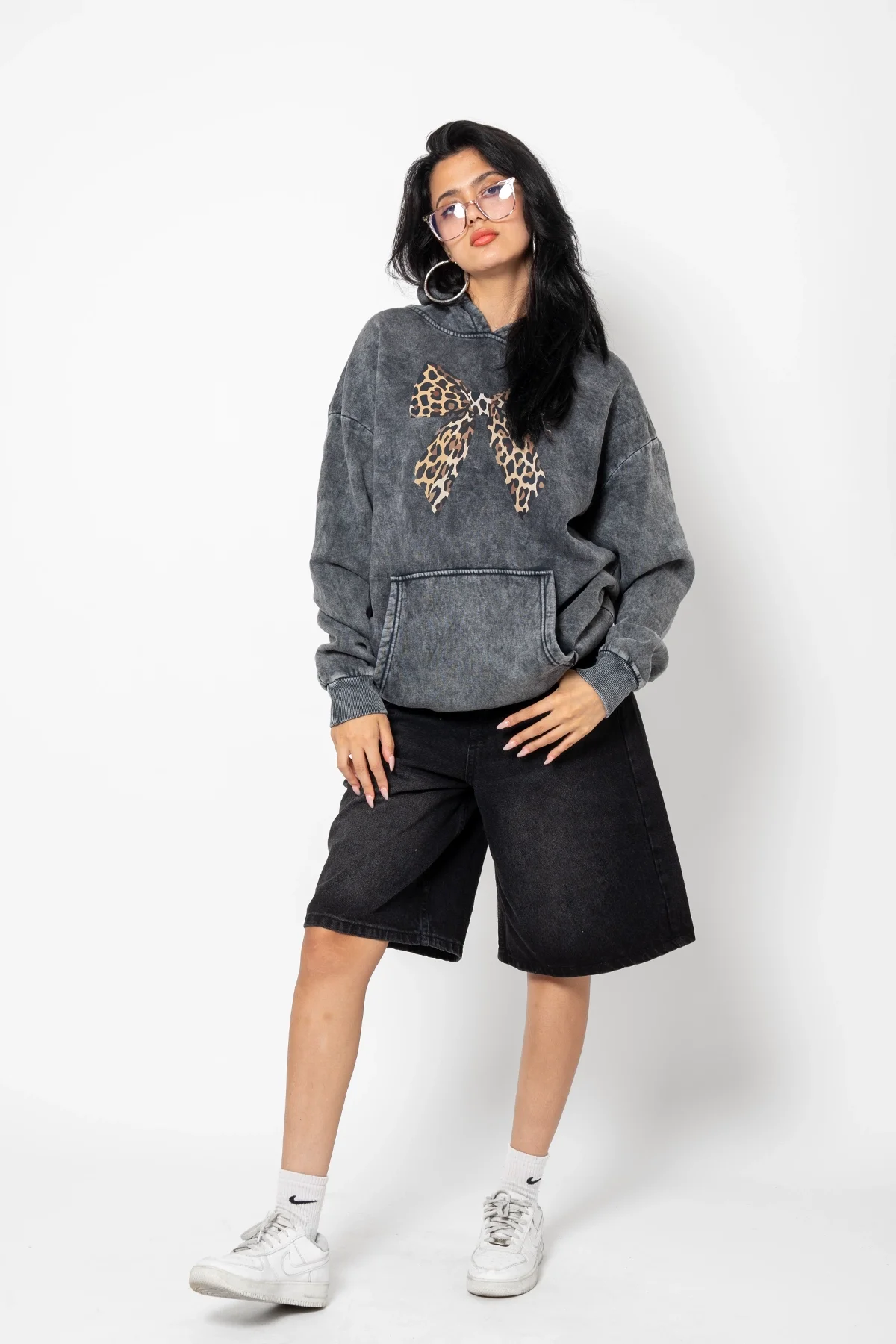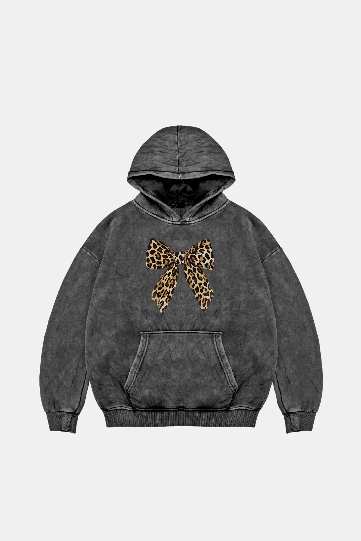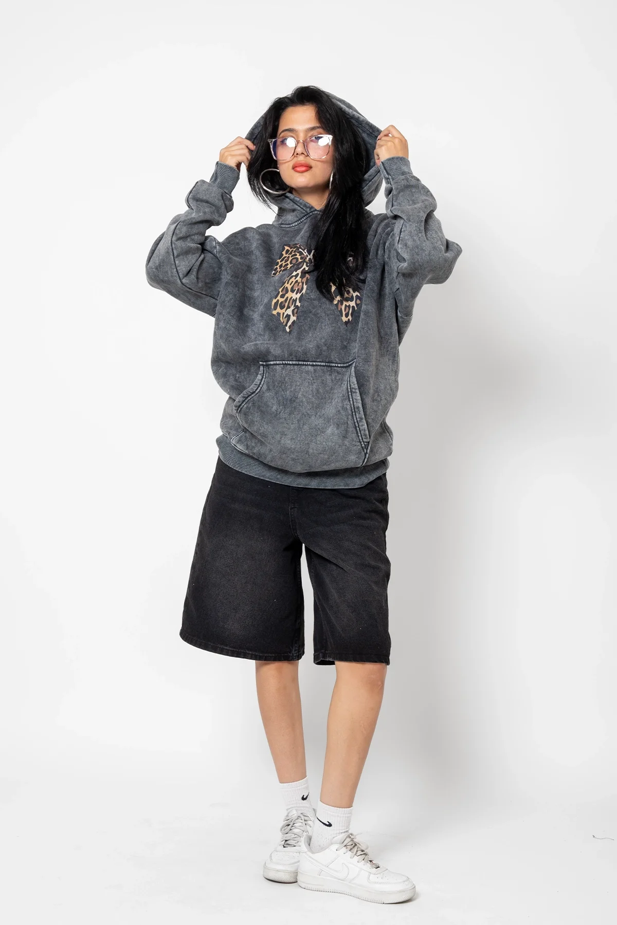 FİYONK LEOPAR BASKILI OVERSİZE UNİSEX PREMİUM YIKAMALI SİYAH HOODİE