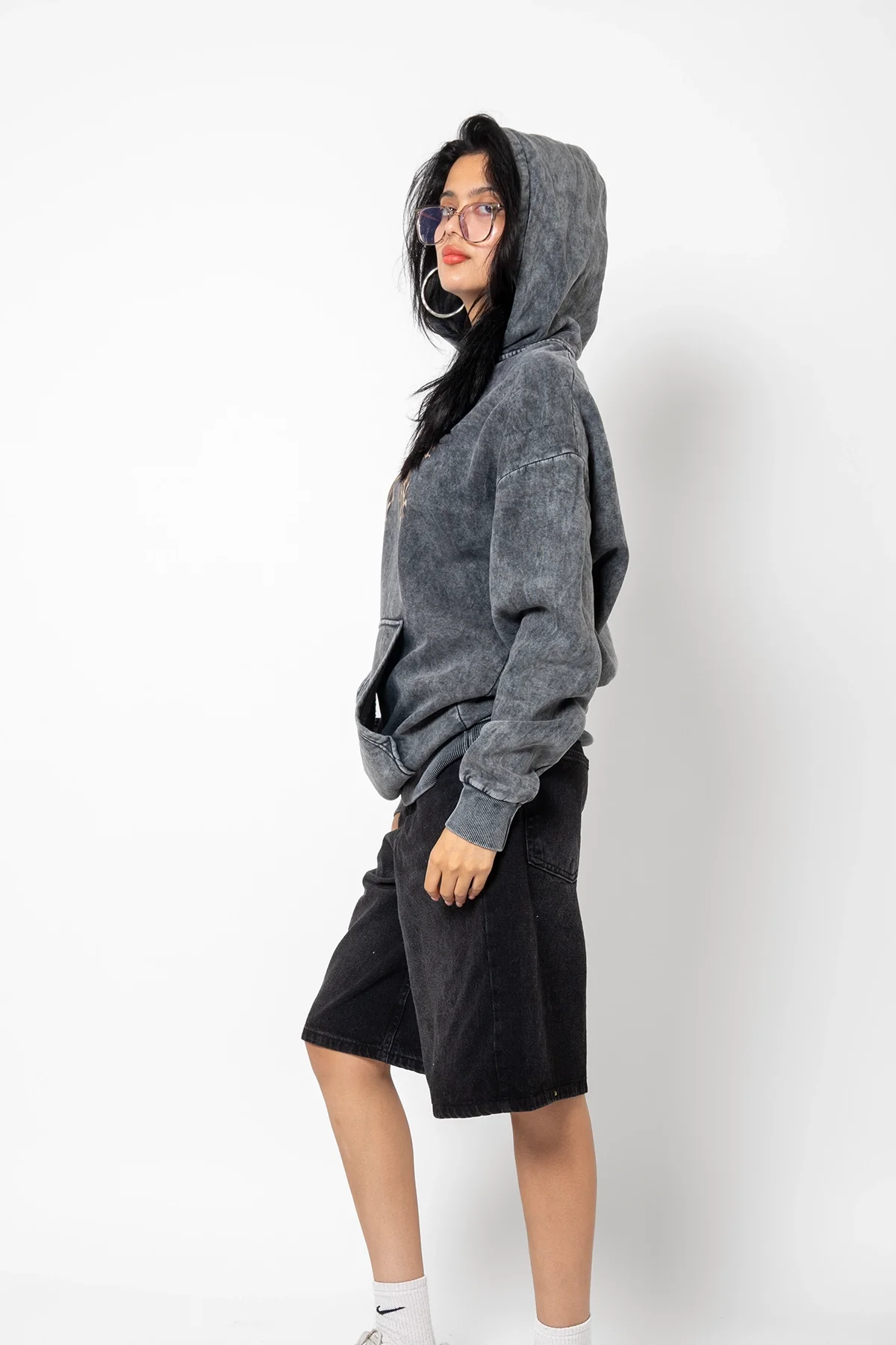 Bat Yarasa Baskılı Oversize Unisex Yıkamalı Siyah Hoodie