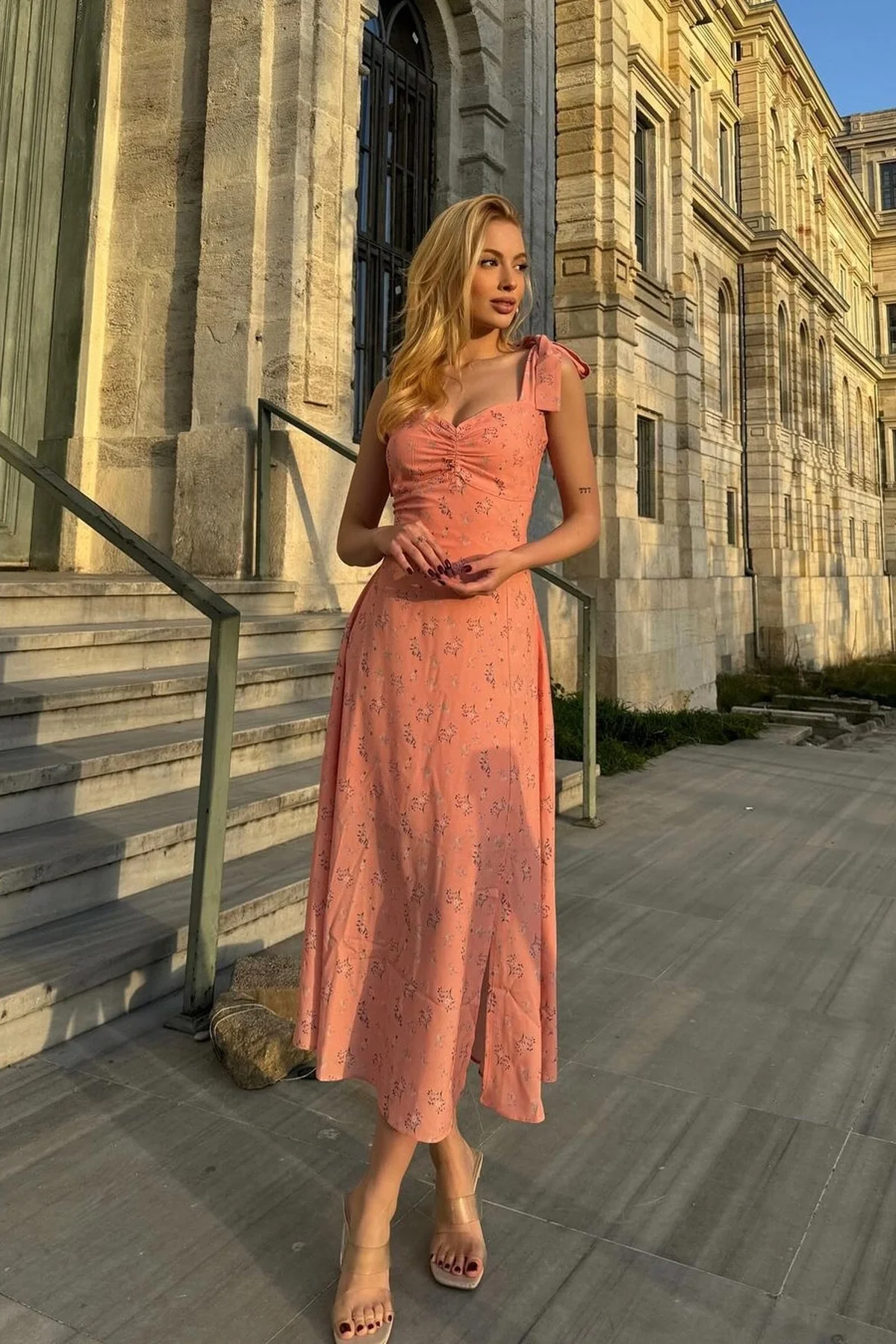 GENİŞ ASKILI ÇİÇEKLİ MİDİ BOY YAVRU AĞZI YIRTMAÇLI ELBİSE