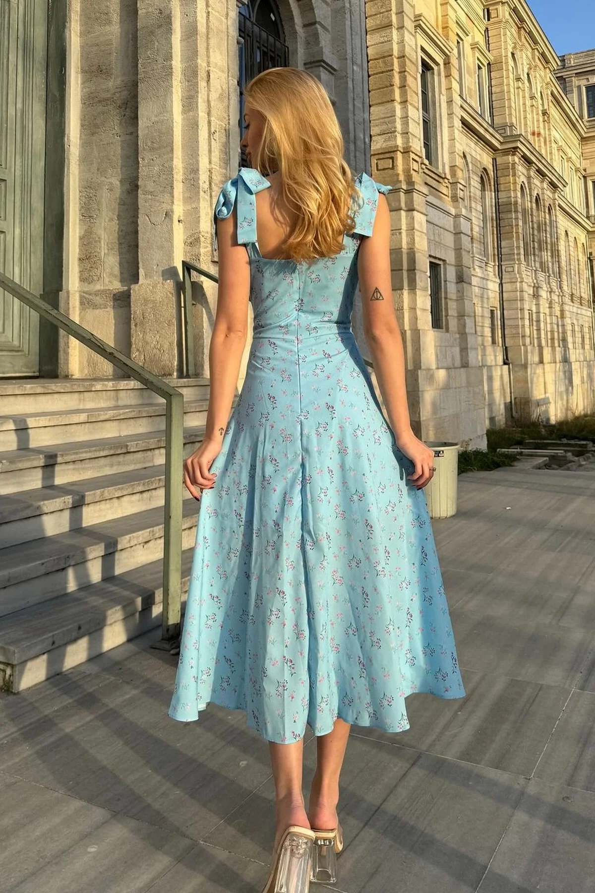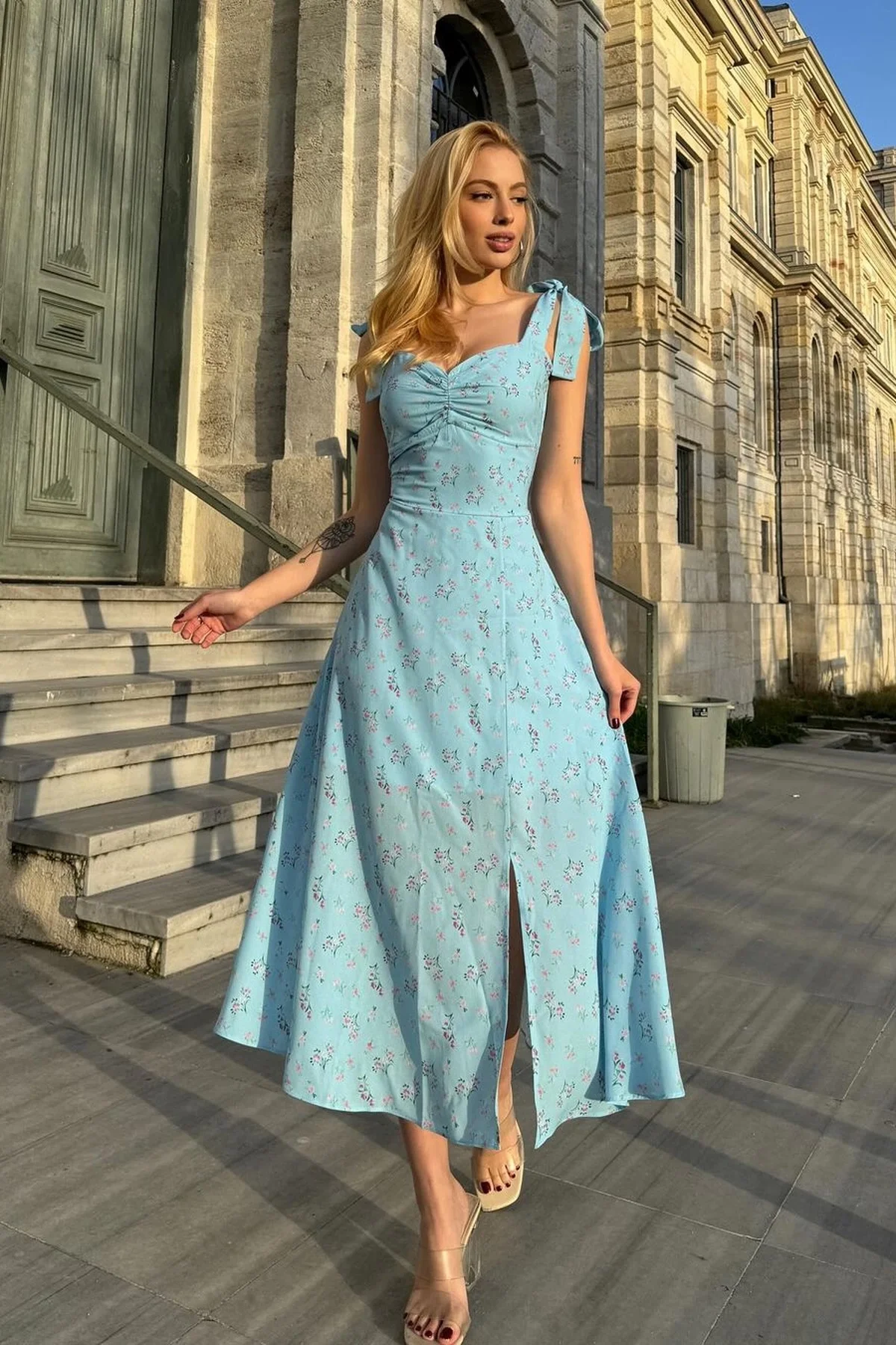 GENİŞ ASKILI ÇİÇEKLİ MİDİ BOY MAVİ YIRTMAÇLI ELBİSE