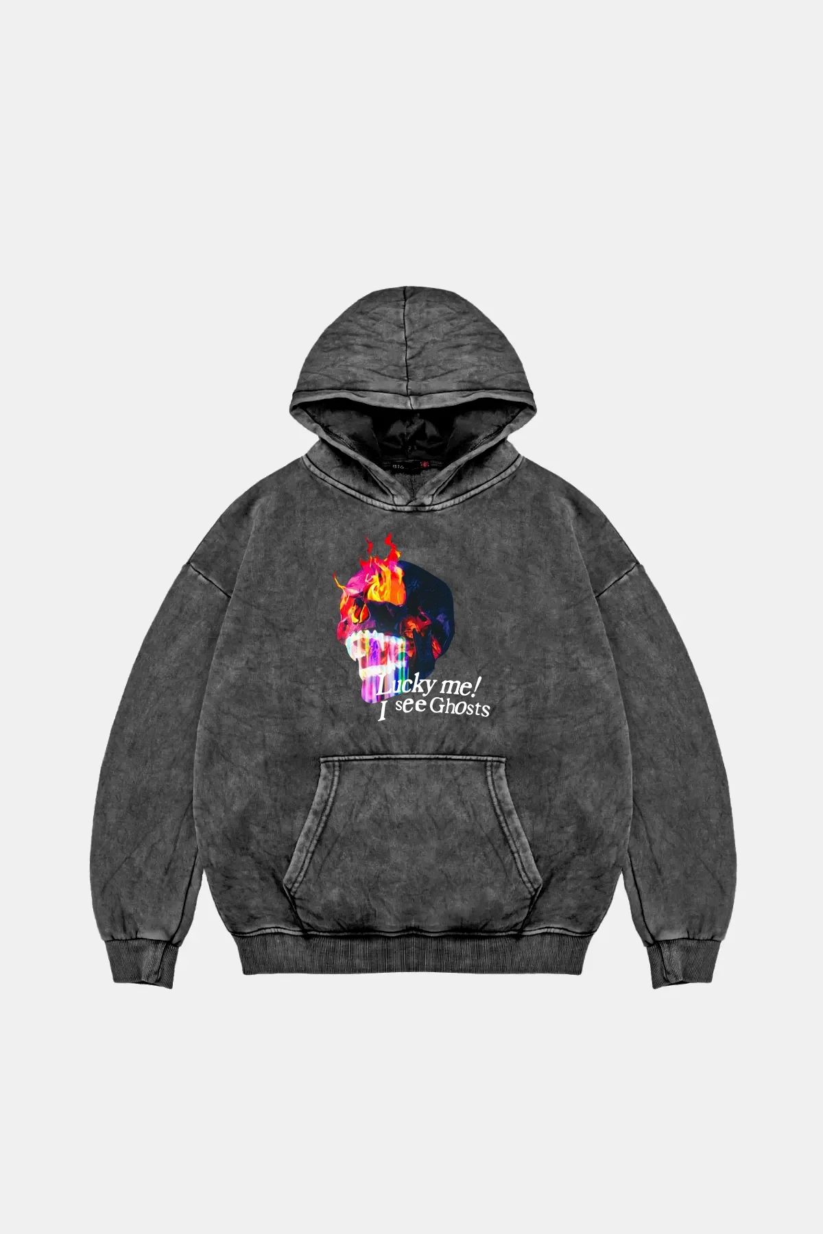 I SEE GHOSTS BASKILI OVERSİZE UNİSEX PREMİUM YIKAMALI SİYAH HOODİE