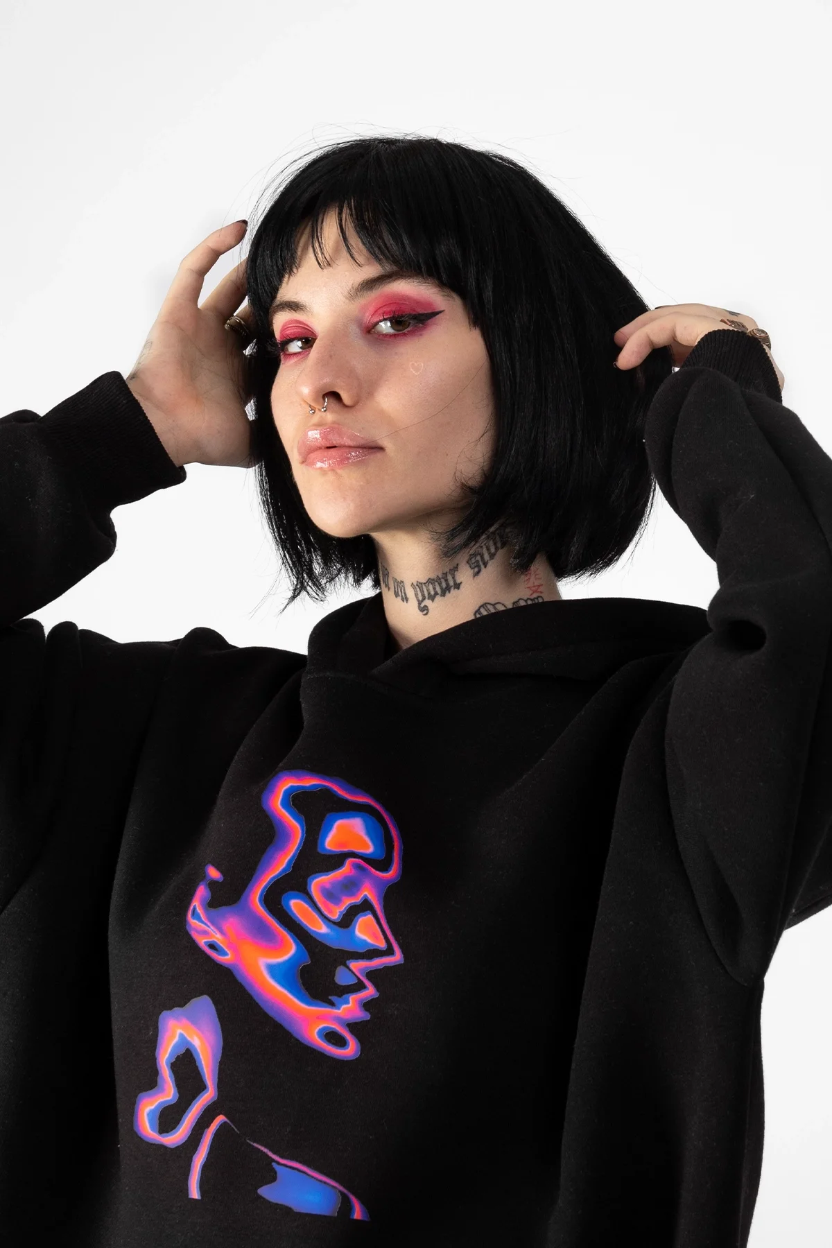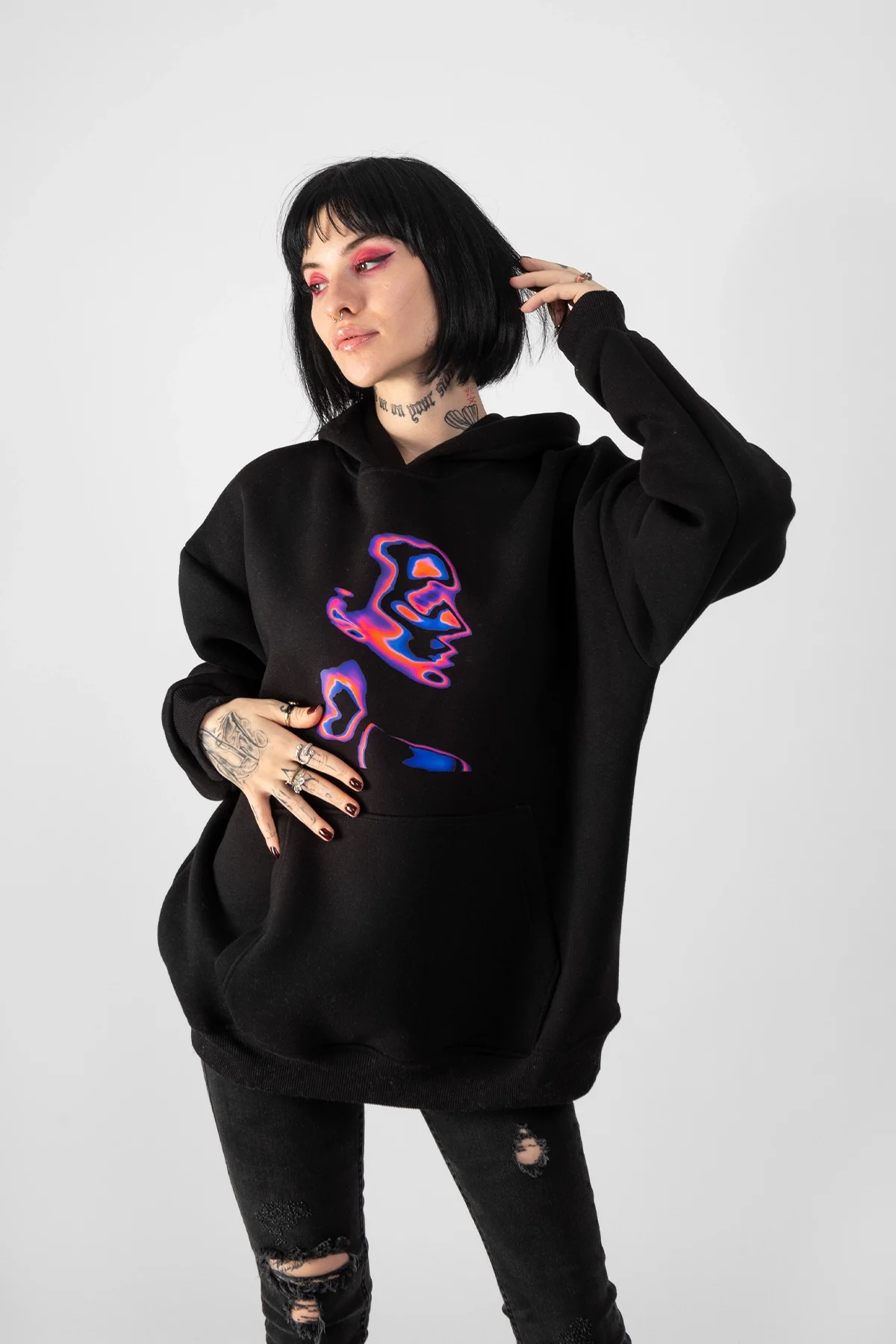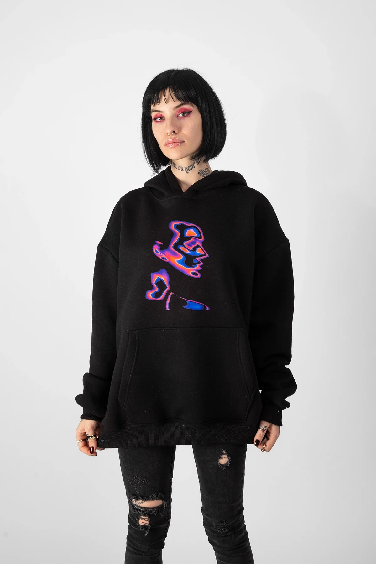 İLLUSİON WOMAN BASKILI OVERSİZE UNİSEX SİYAH HOODİE