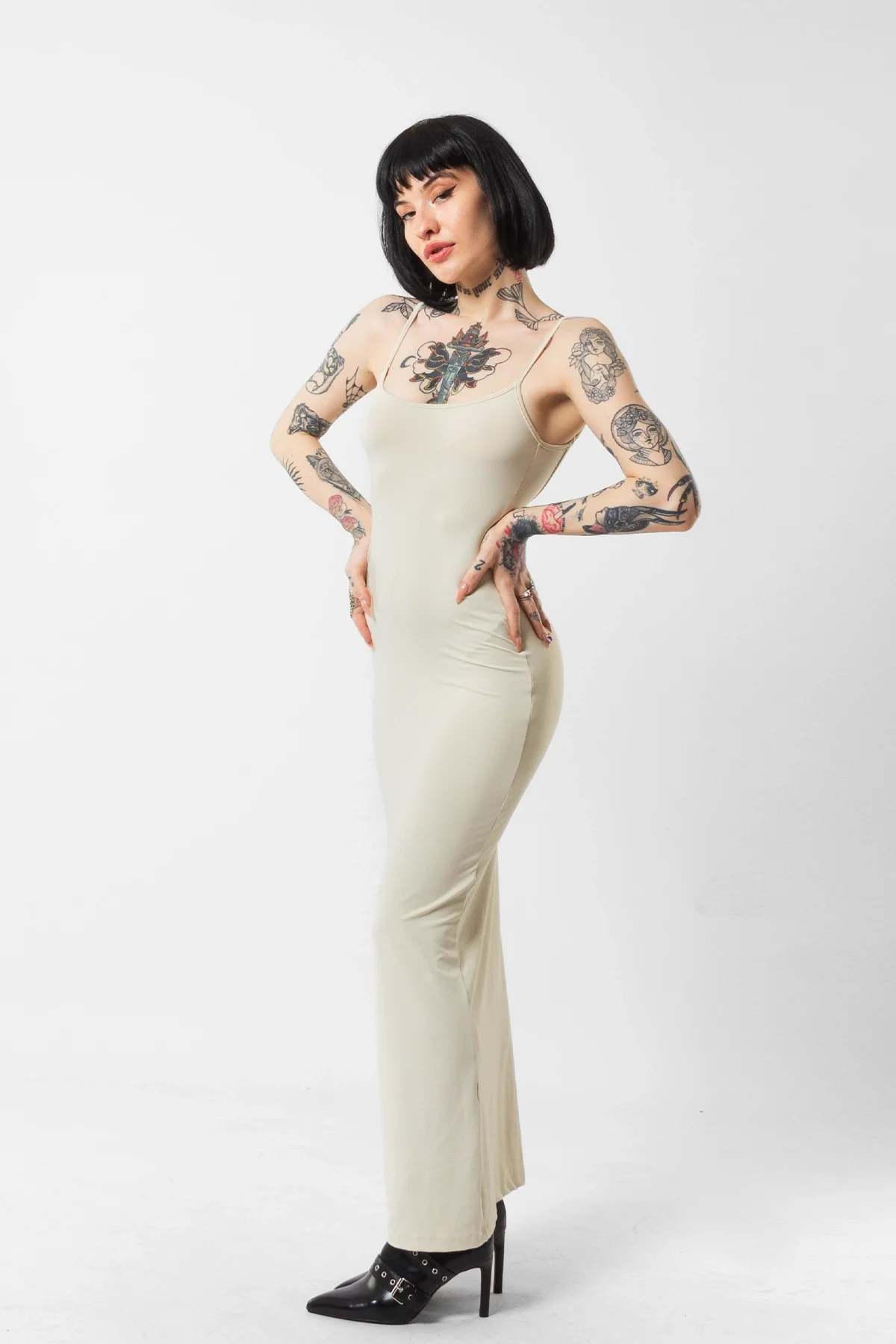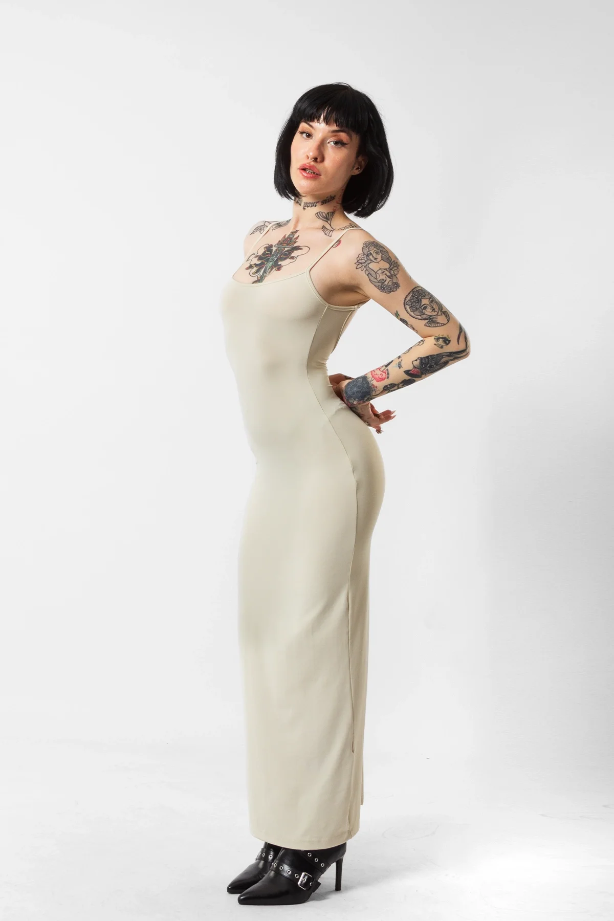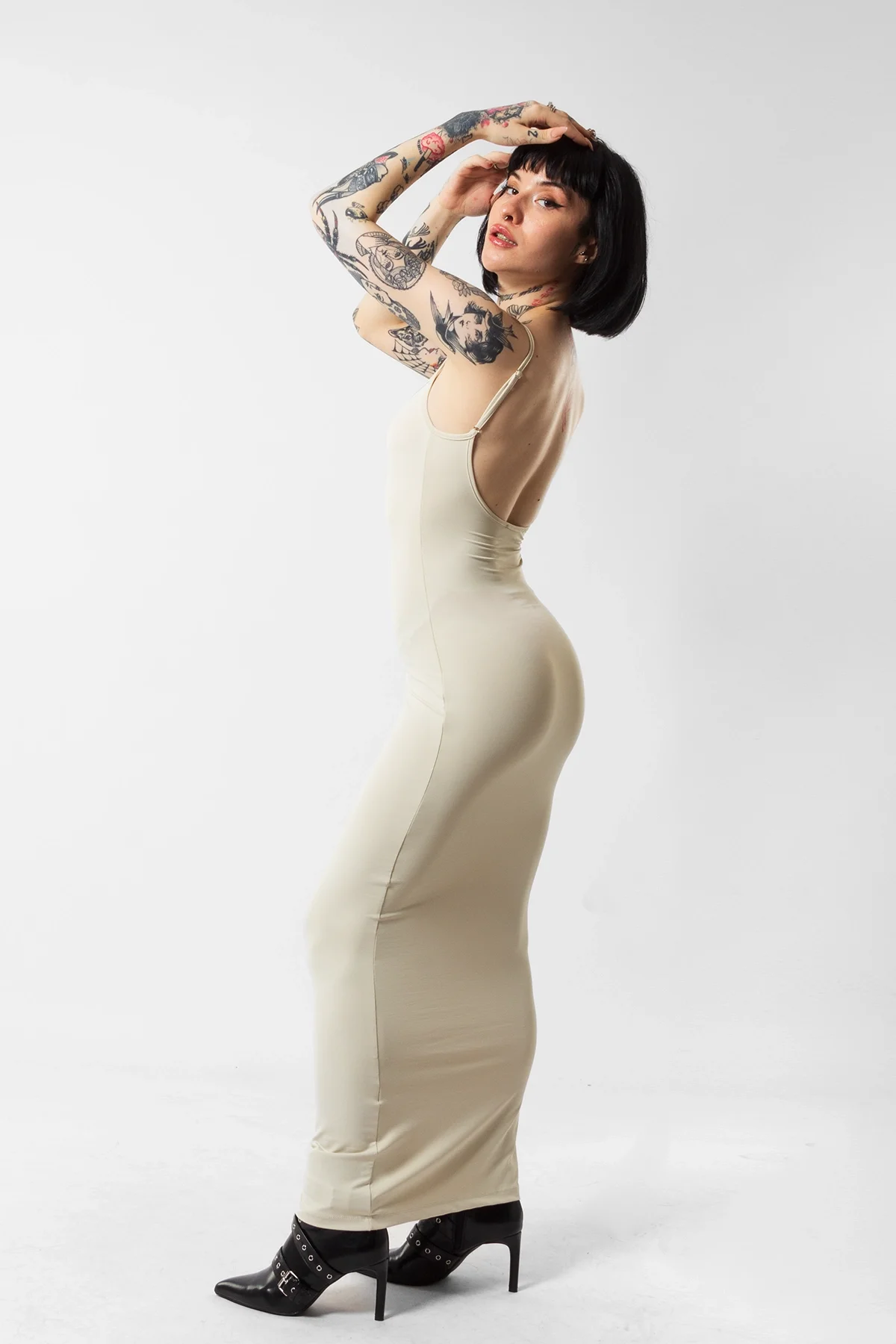 Zamansız şıklığı modern detaylarla birleştiren bu uzun elbise, sade ama çarpıcı tarzıyla dikkat çekiyor. İnce askı detayları ve cesur sırt dekoltesiyle feminenliğin ön planda olduğu bu tasarım, zarif bej rengiyle her ten tonuna uyum sağlar.